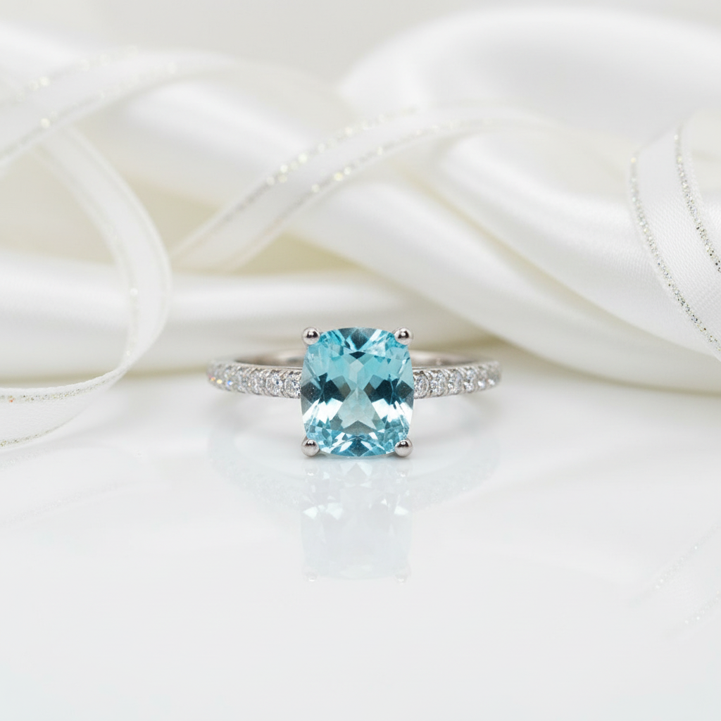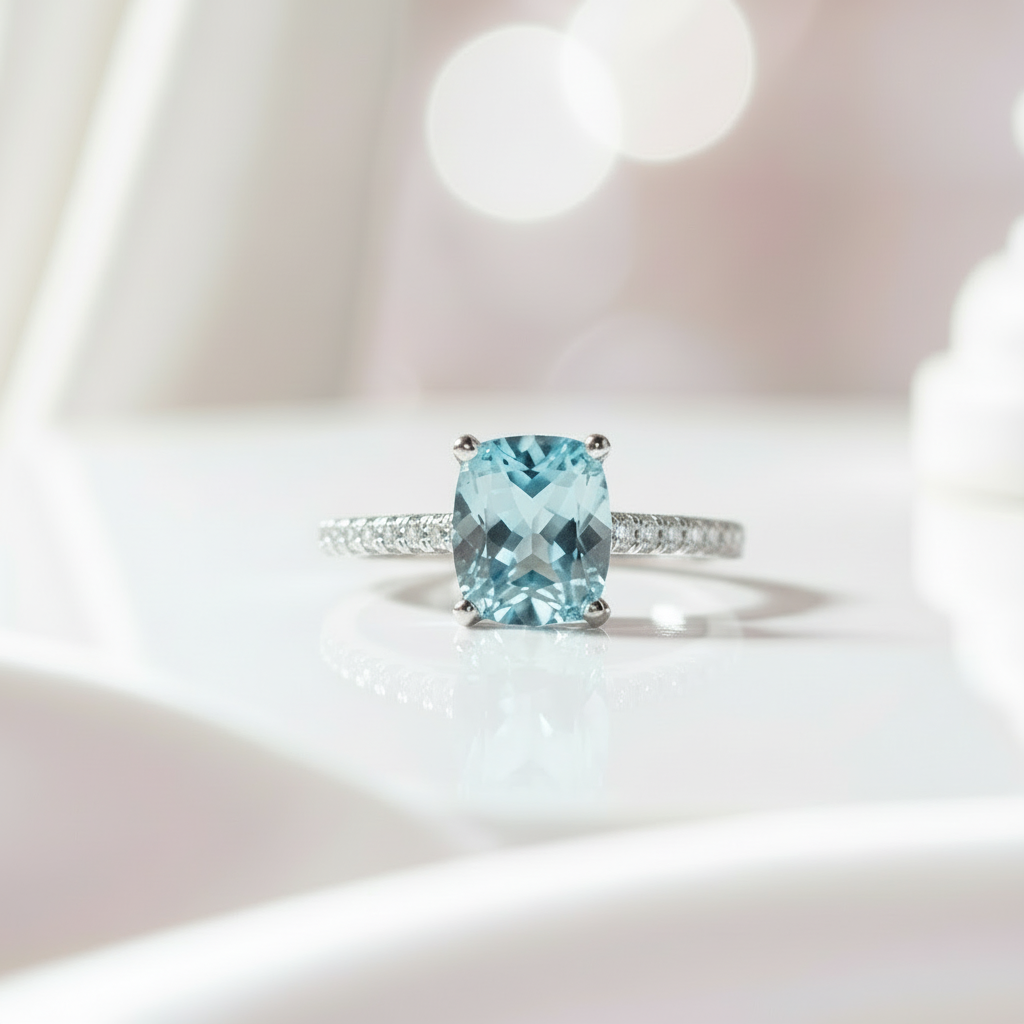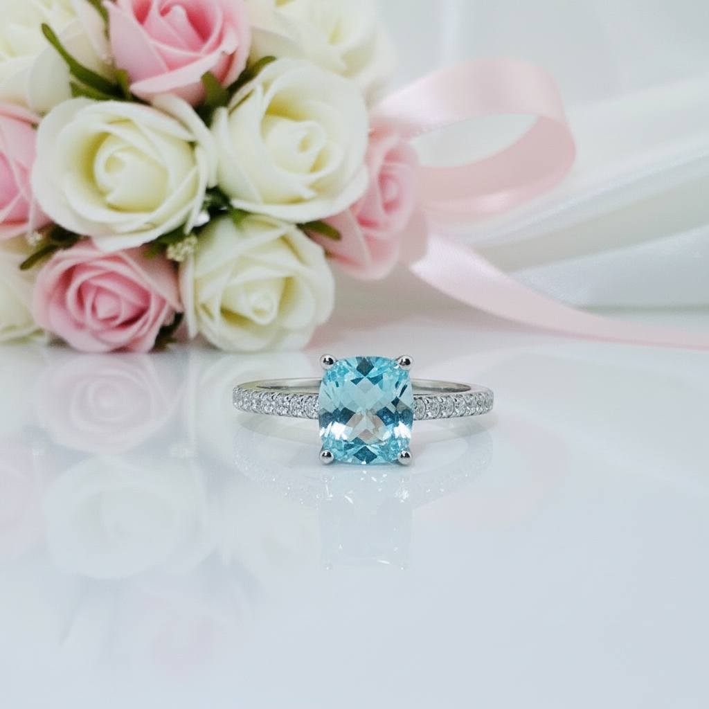 Enchant your beloved with the timeless beauty of our 14k White Gold 1.5 Ct Light Blue Moissanite Engagement Ring by Black Diamonds New York. The cushion-cut blue diamond is a vision of perfection, radiating a captivating allure that symbolizes your deep bond. This stunning ring is crafted with precision and care, ensuring a high-quality piece that is as affordable as it is exquisite.
