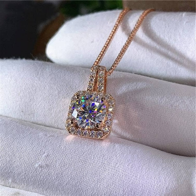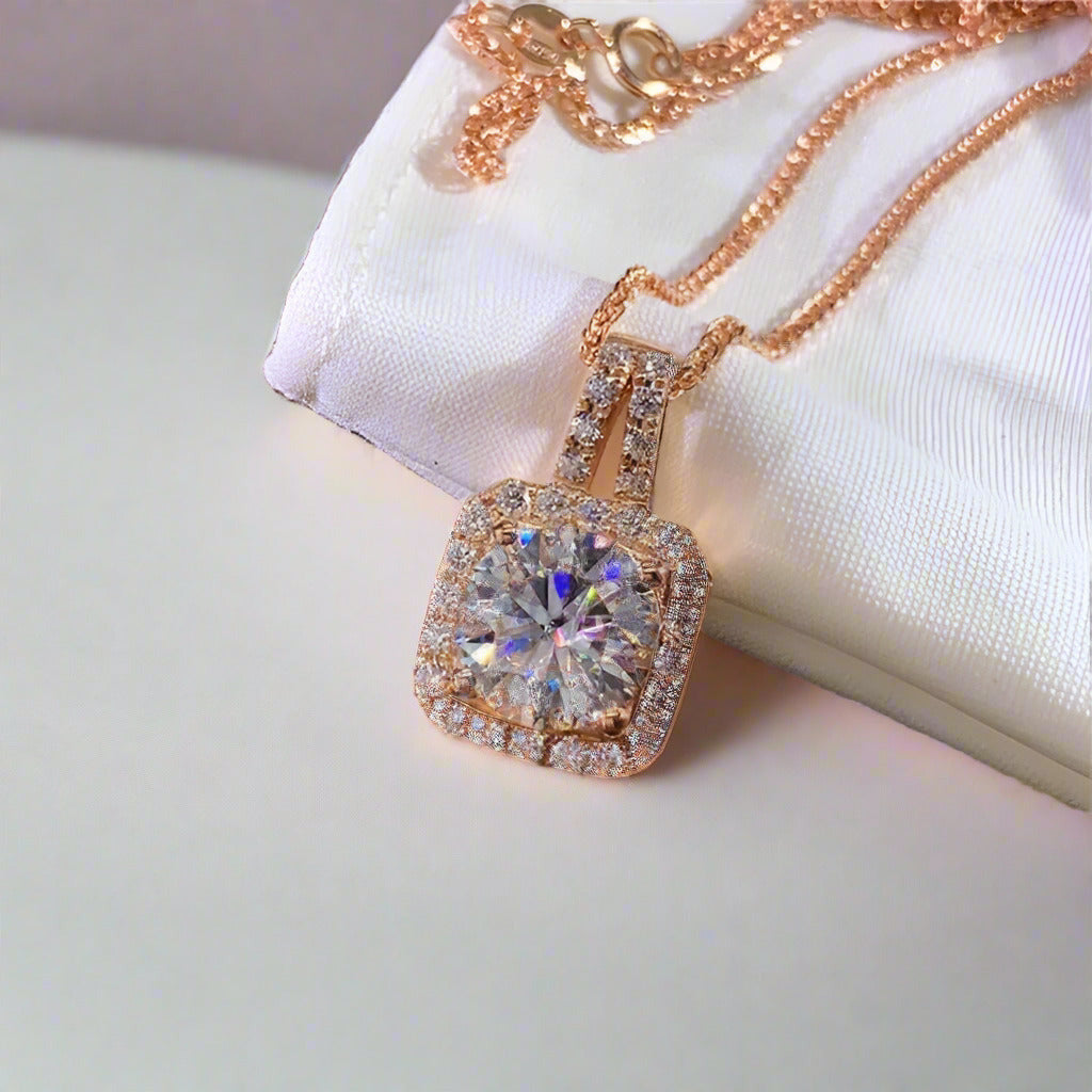 Make a statement with our exquisite 18k Rose Gold Round Certified Moissanite Necklace by Black Diamonds New York. Featuring a stunning 5 carat round cut moissanite complemented by a halo frame, this necklace radiates beauty and grace. Crafted with the highest quality materials, this gorgeous piece is both affordable and mesmerizing. Elevate your style with this luxurious necklace that is sure to turn heads.