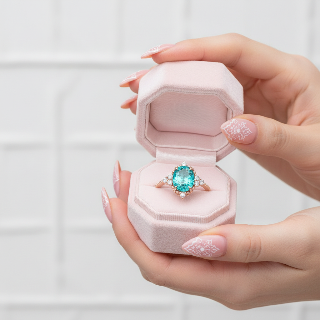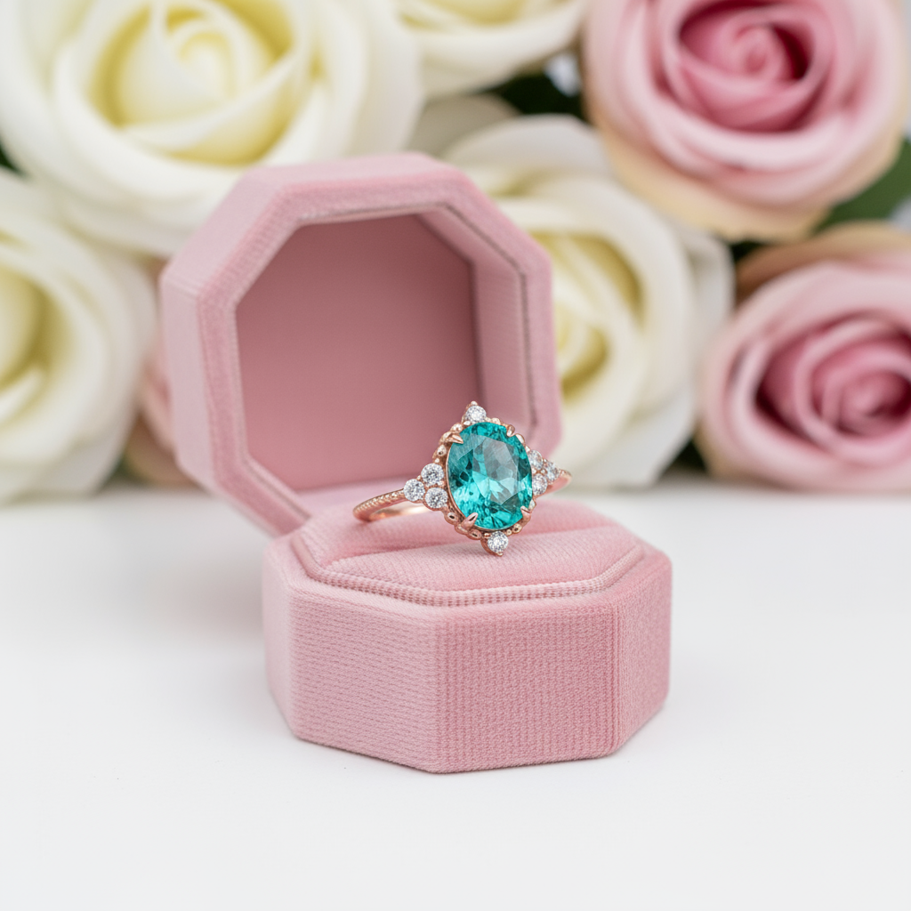 Let yourself be captivated by this Vintage Rose Gold Oval Cut Paraiba Tourmaline Engagement Ring. Constructed with 14k rose gold and featuring an exquisite oval-cut, green diamond encircled by transparent side stones, this beautiful item of jewelry is the perfect way to express your love. Additionally, its delicate craftsmanship and vintage aesthetic grant this piece a special aura. Most notably, its high quality and eye-catching design are presented at a budget-friendly cost.