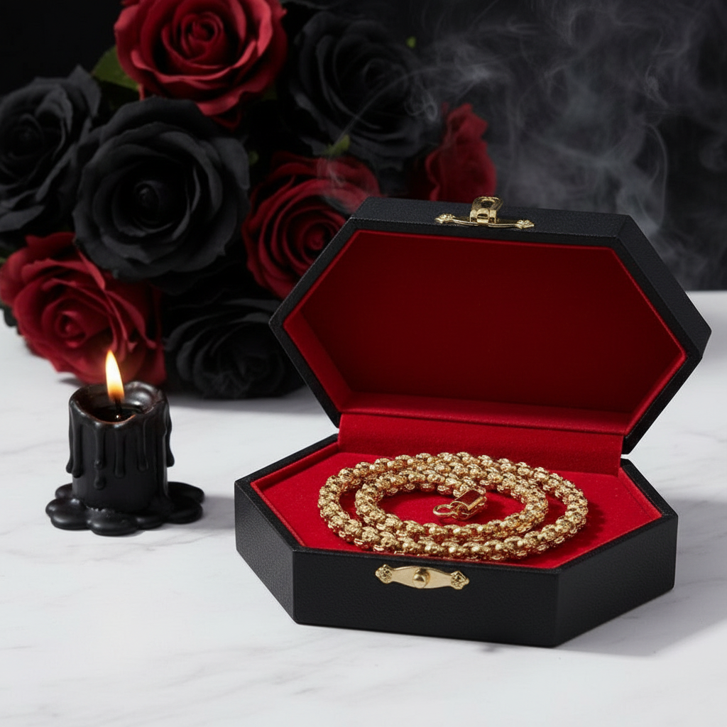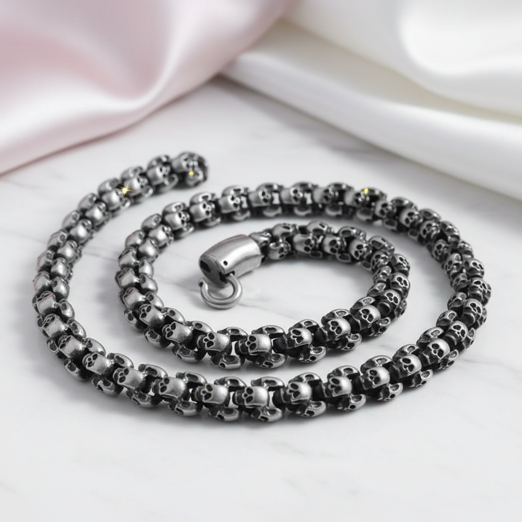 Imbued with a sense of rebelliousness and edginess, this necklace boasts a striking rock skull head pendant delicately attached to a stainless steel link chain. The metallic color options in gold and antique silver give it a luxurious feel, while the finish options of vintage, shiny, or brushed add a touch of artistic flair.