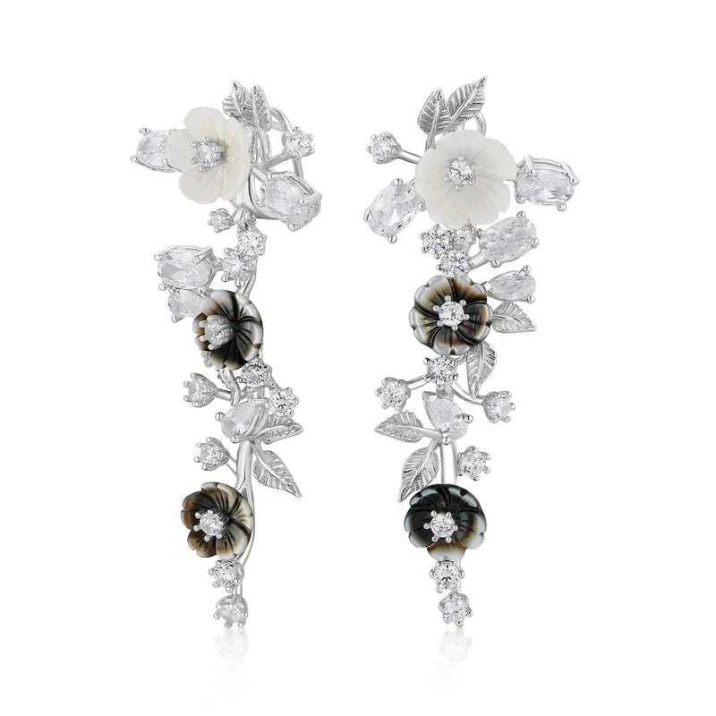 This set of classic drop earrings boasts a composition of 925 sterling silver with a stunning main stone made of created diamond and shell. The side stone features another natural material, while the earrings are stamped with 925 to signify their high-quality metal type.