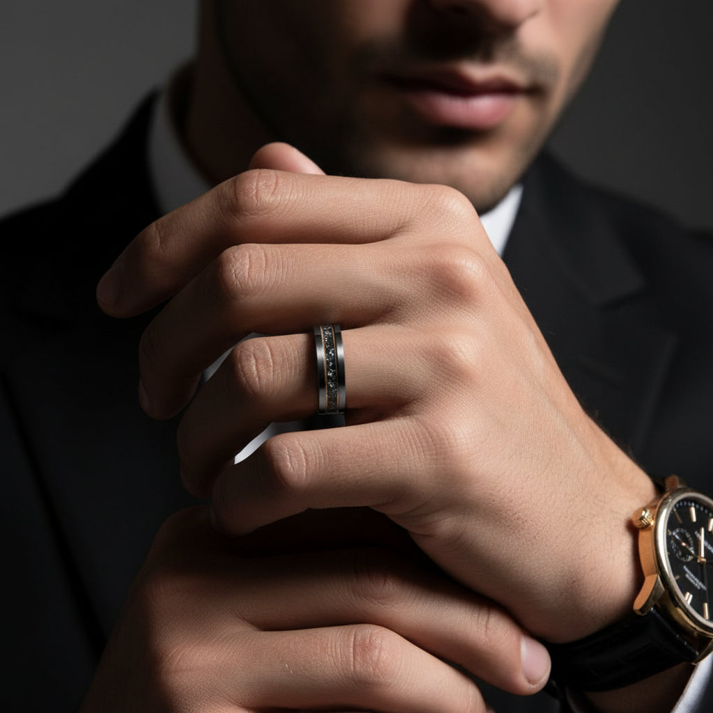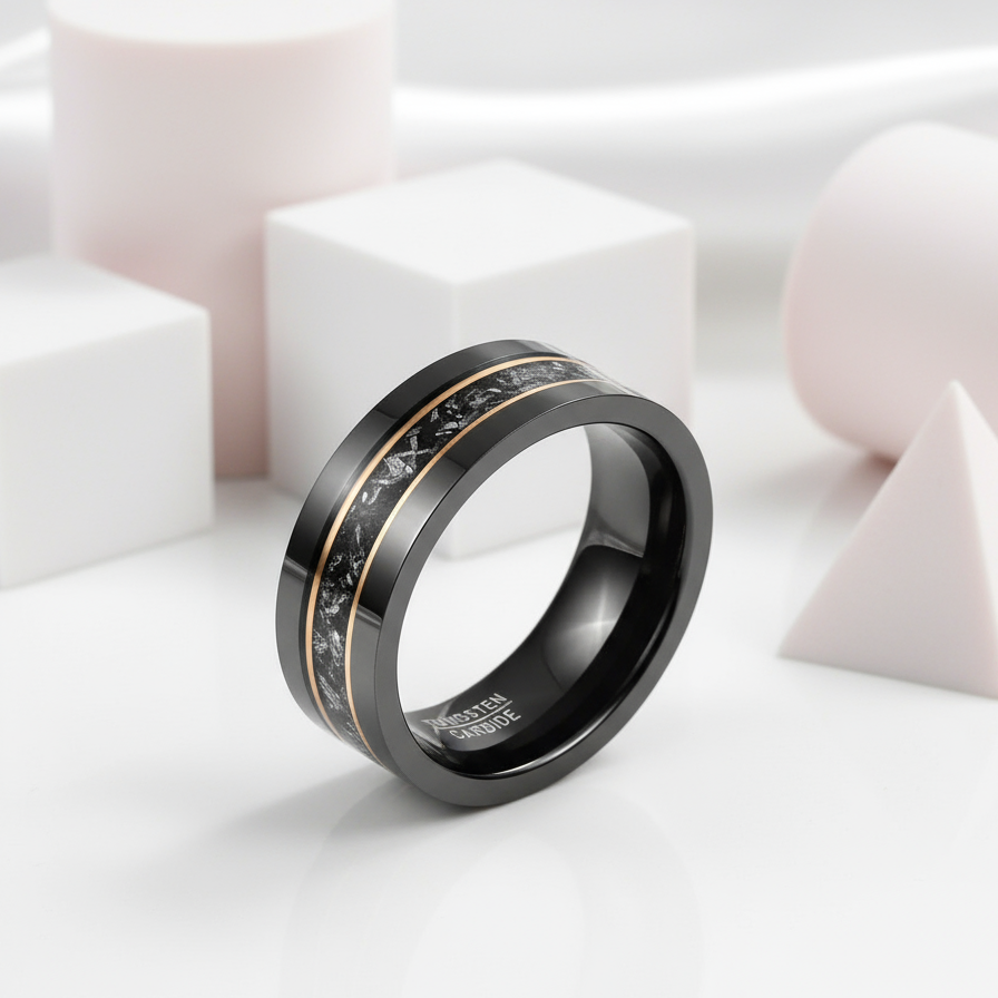 Crafted from the finest black meteorite and tungsten carbide, this 8mm men's ring boasts an inlay of rose gold and a sleek, polished finish that exudes strength and sophistication.