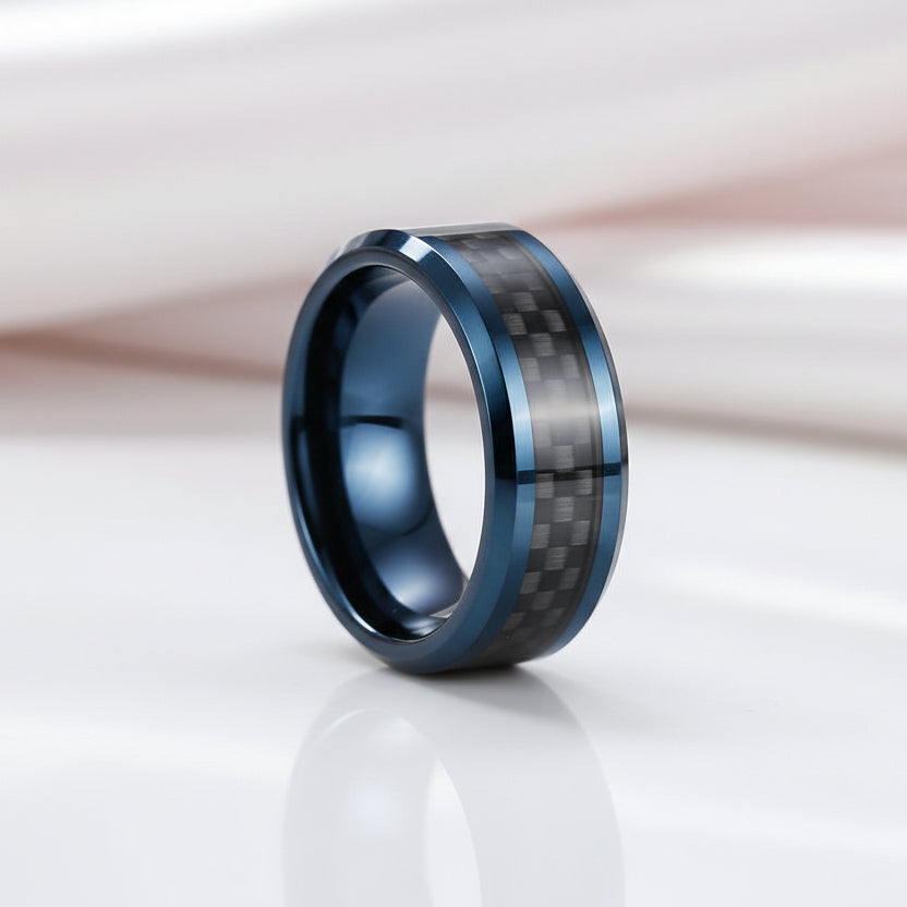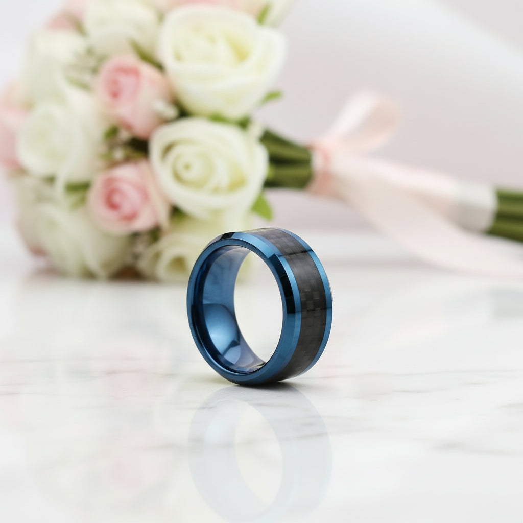 Elevate your style with this premium Blue & Black Classical Tungsten Wedding Band. Made from ethically sourced materials, this band is built to last a lifetime. Say farewell to dull and overpriced options. With a sleek 8mm surface width, this band is the epitome of luxury.