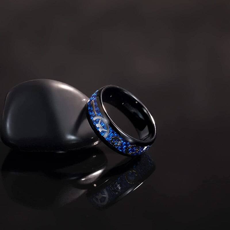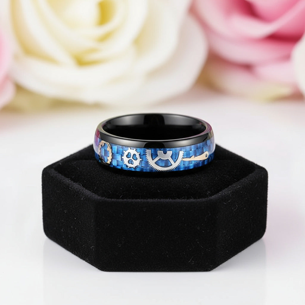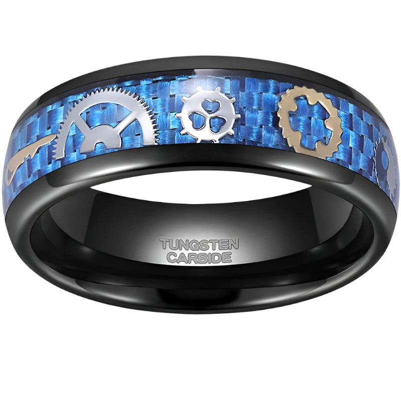 This 8mm tungsten wedding band features a unique steampunk inlay, combining durability with distinctive style. Crafted from high-quality, ethically sourced materials, it offers a lasting symbol of your commitment without the high price.