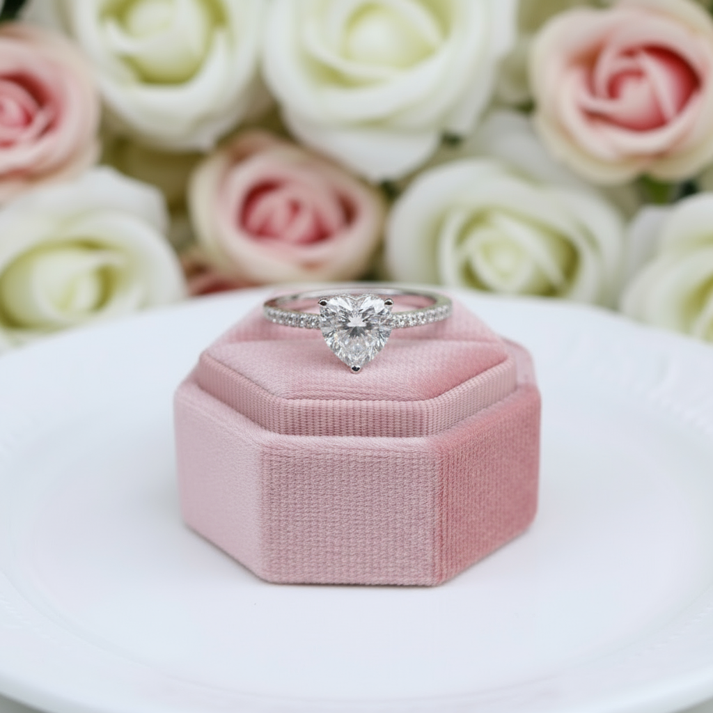 Rose gold ring and diamond ring on a pink velvet box with blurred flowers in the background