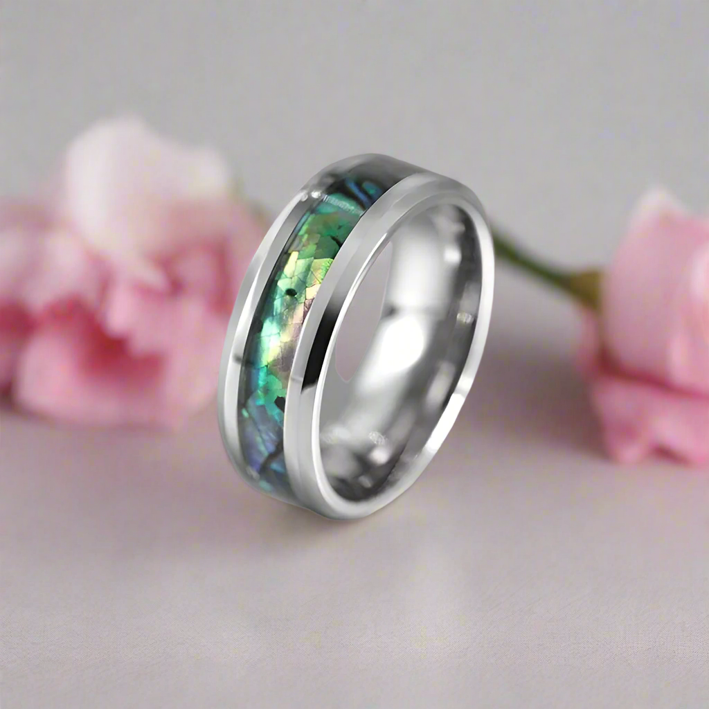 Show your lasting love with this one-of-a-kind Abalone Shell Men's Titanium Wedding ring from Black Diamonds- New York. Crafted from top-quality and ethically sourced materials, this 8mm titanium band is durable and sure to last a lifetime. With its unique and beautiful abalone shell design, never again feel like you are settling with a boring, overpriced wedding band.