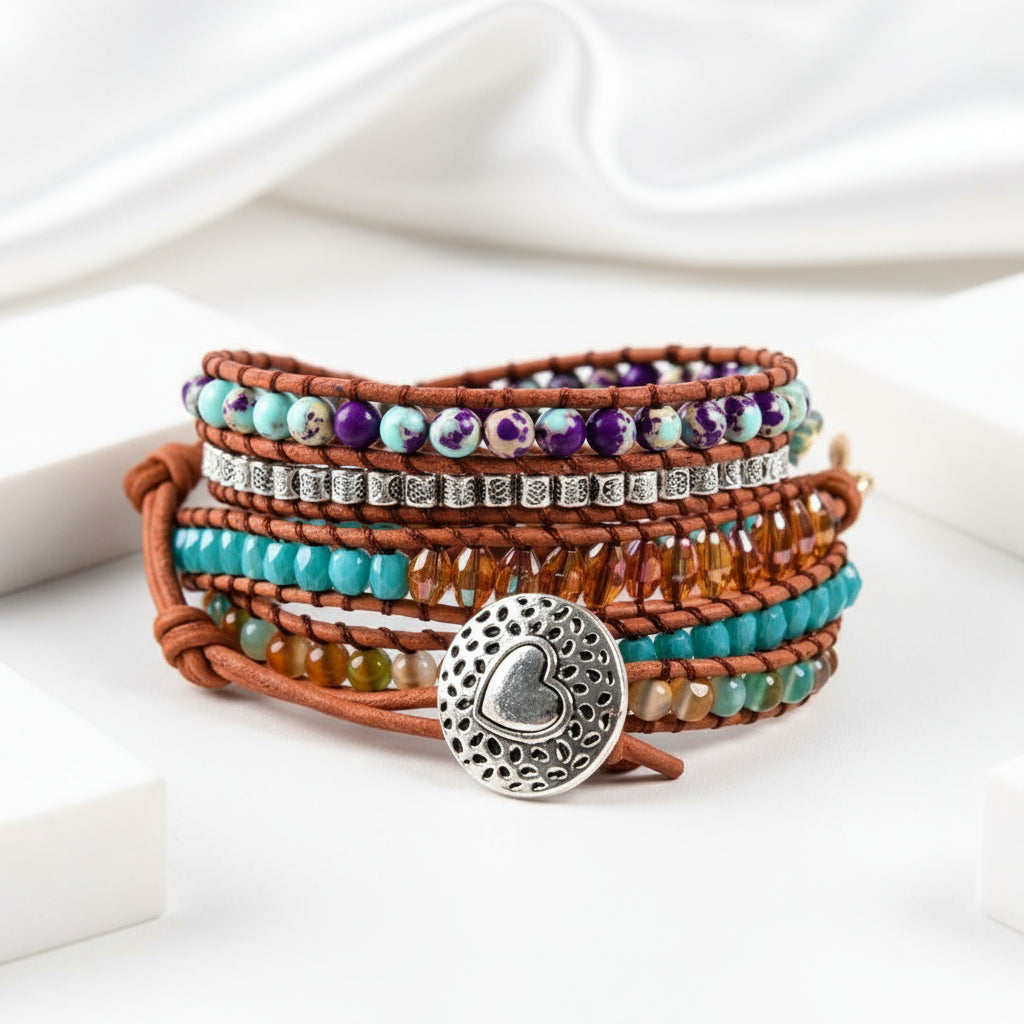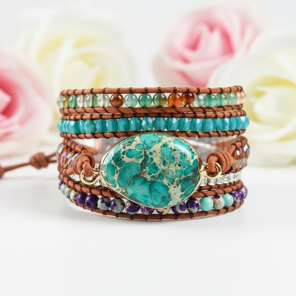 Experience a touch of natural beauty with our Ocean Jasper & Mixed Stone Bohemian Bracelet, crafted using luxurious natural stone, supple leather, and modern alloy techniques for a truly handmade masterpiece.