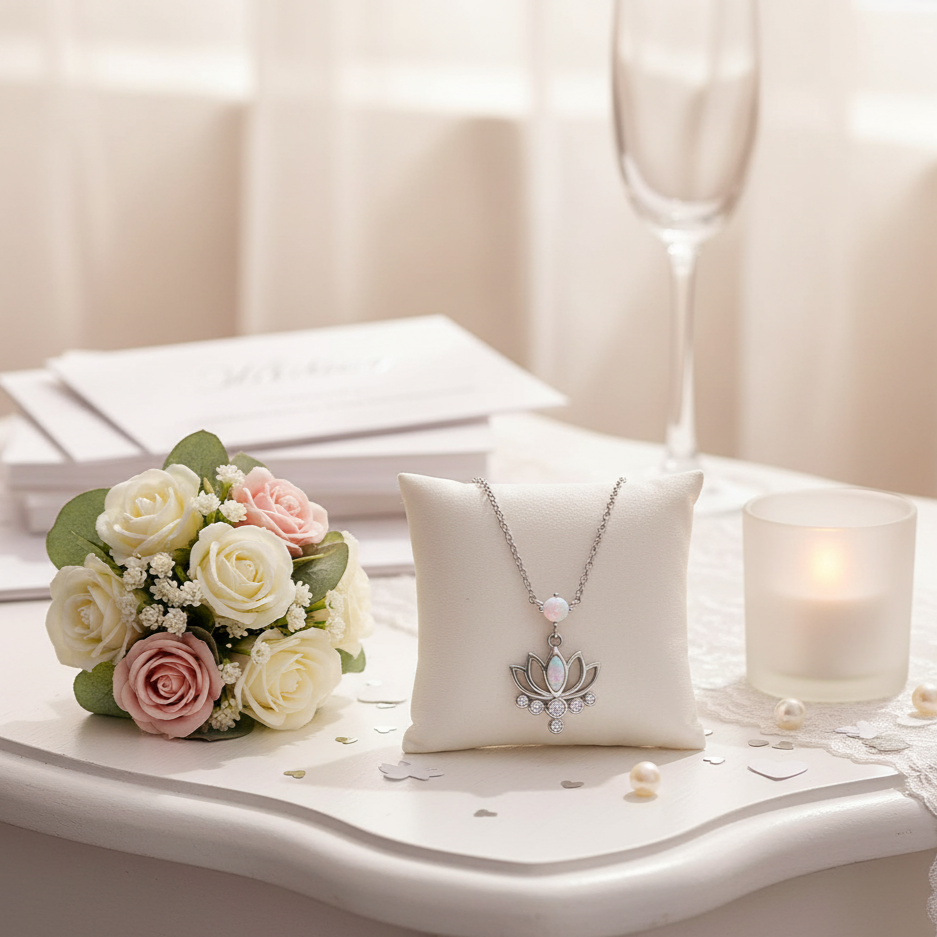 Pink Opal Lotus Flower Pendant Necklace featuring a stunning pink stone centerpiece set in 925 silver with white gold plating. The lotus flower symbolizes purity and enlightenment, making this piece both beautiful and meaningful. Crafted for durability and designed to turn heads, it's the perfect blend of luxury and affordability.
