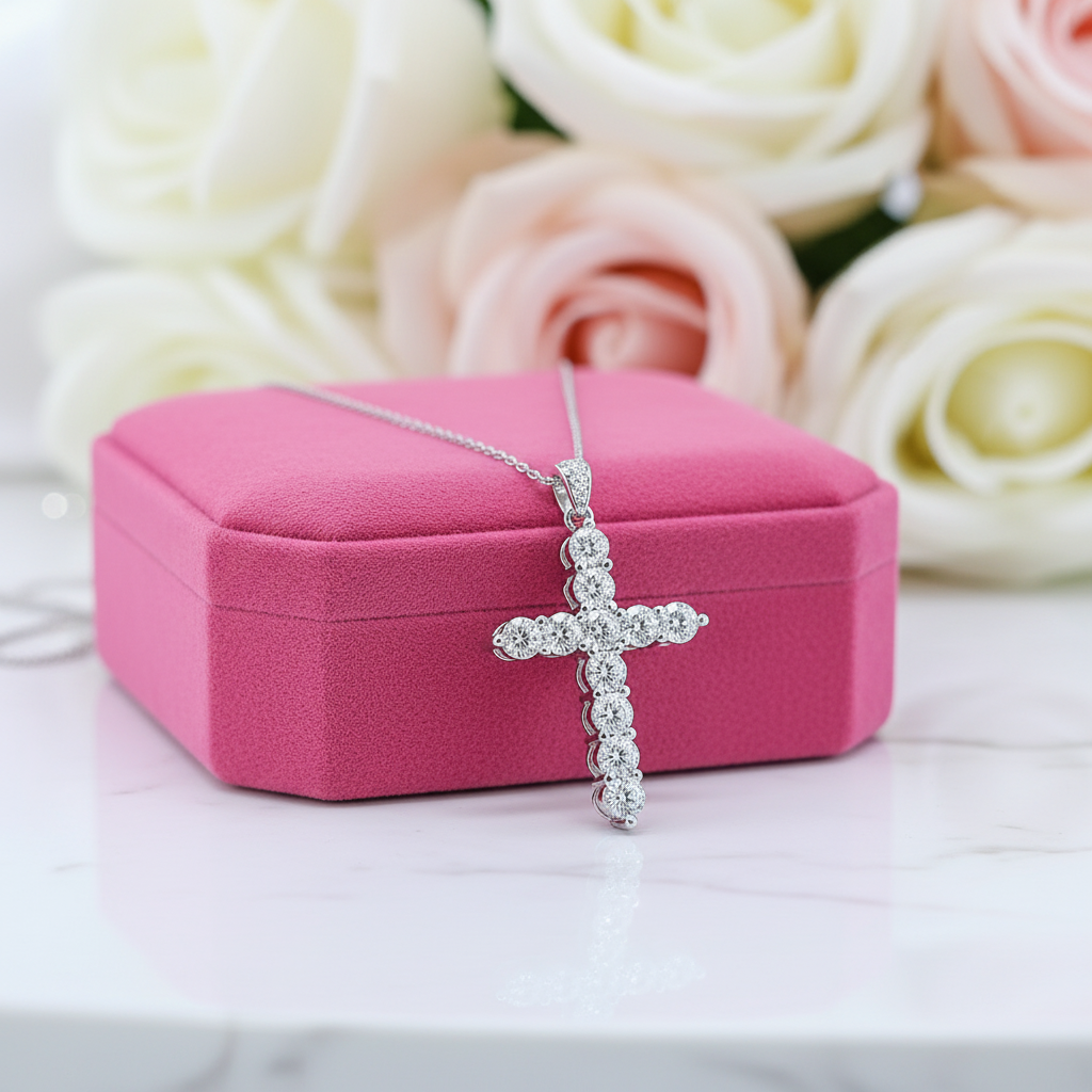 Experience the elegance of the Round Full Diamond Cross Pendant Necklace from Black Diamonds New York. Featuring a brilliant round moissanite and crafted in 925 silver with five layers of 18k white gold plating, this necklace shines with lasting beauty. Add a touch of luxury to any look at an affordable price.