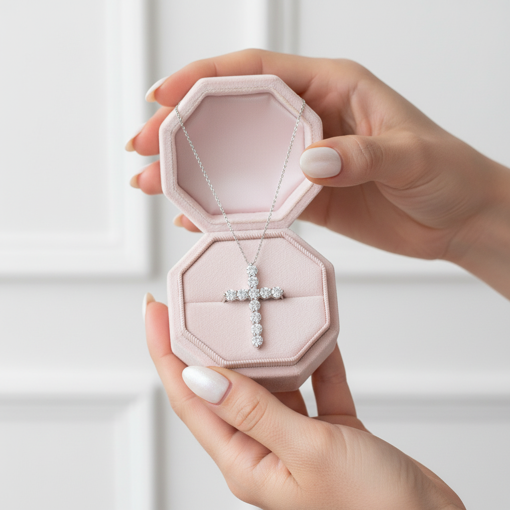 Round Full Diamond Cross Pendant Necklace