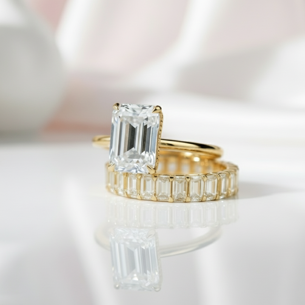 Yellow Gold 3.5ct Emerald Cut Engagement Ring & Emerald Cut Band