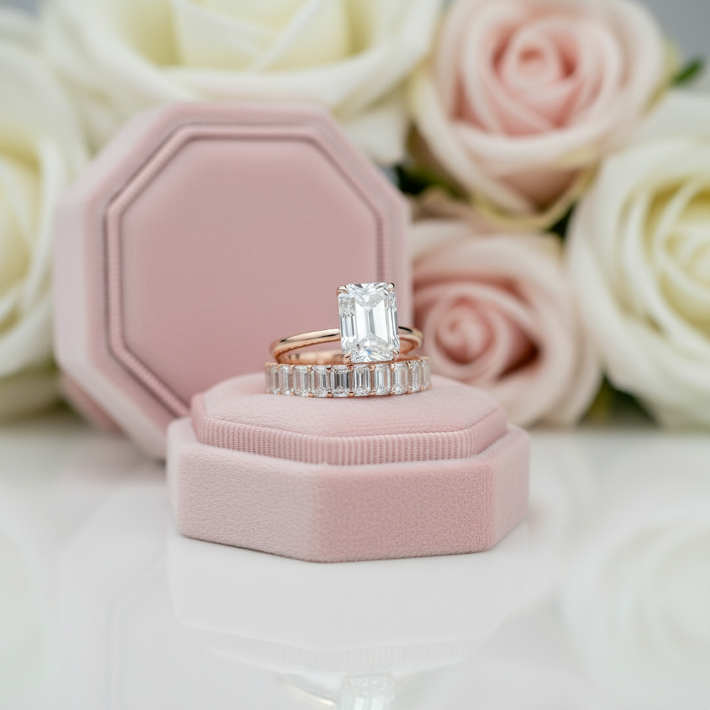 Rose gold ring and diamond ring on a pink velvet box with blurred flowers in the background