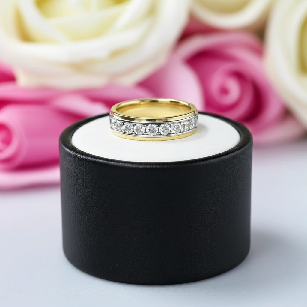 Seeking a timeless accessory that seamlessly blends simplicity and sophistication? Look no further than our exquisite Two-Tone Brilliant Round Cut Men's Ring Band! Featuring a row of shimmering EVN stones meticulously set on a two-tone band, this ring effortlessly combines elegance and versatility. The round cut stones symbolize enduring beauty and craftsmanship, reflecting your impeccable taste in fine jewelry. Whether it's a casual gathering or a formal event, elevate your style effortlessly with this stunning men's ring that exudes charm and sophistication.