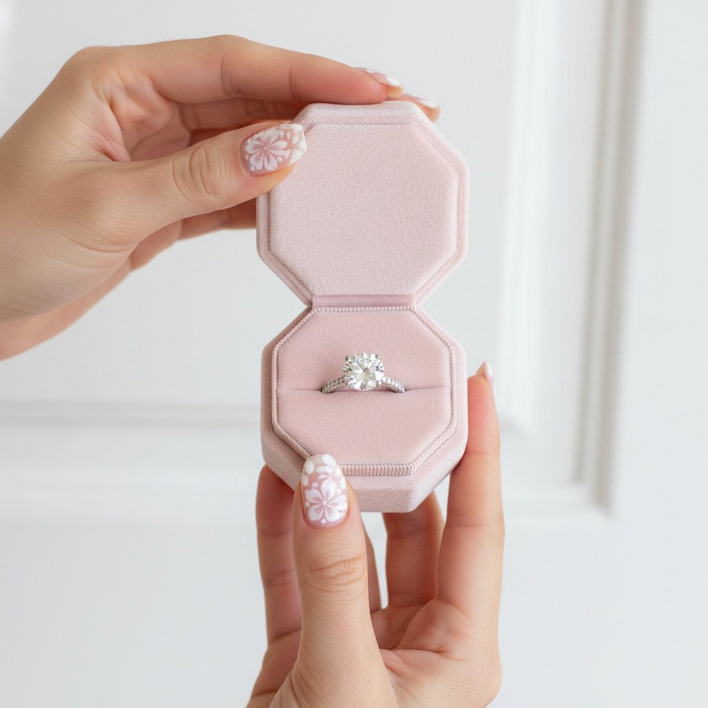 Rose gold ring and diamond ring on a pink velvet box with blurred flowers in the background