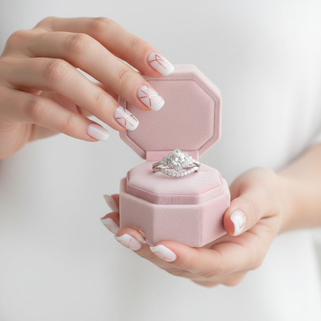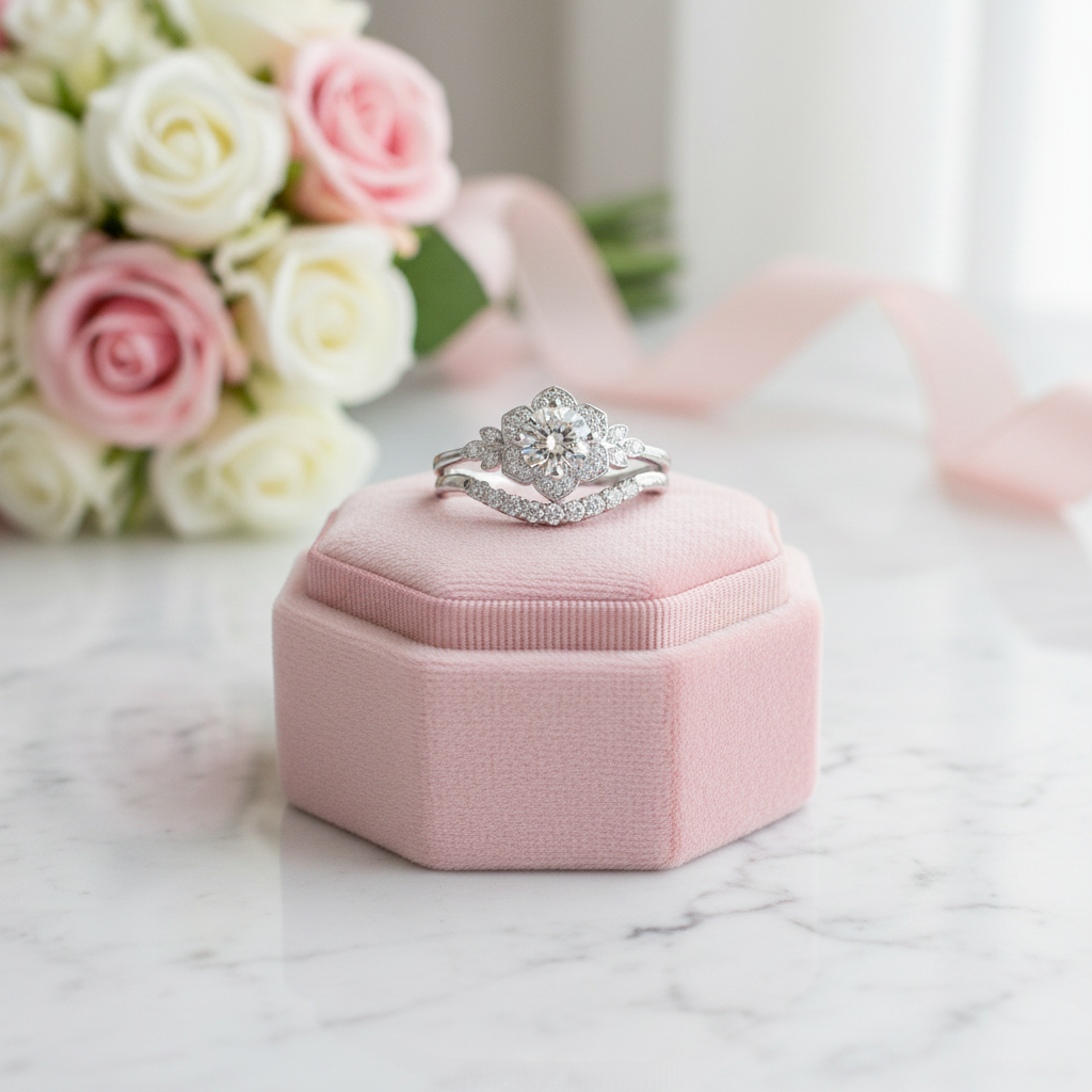 Rose gold ring and diamond ring on a pink velvet box with blurred flowers in the background