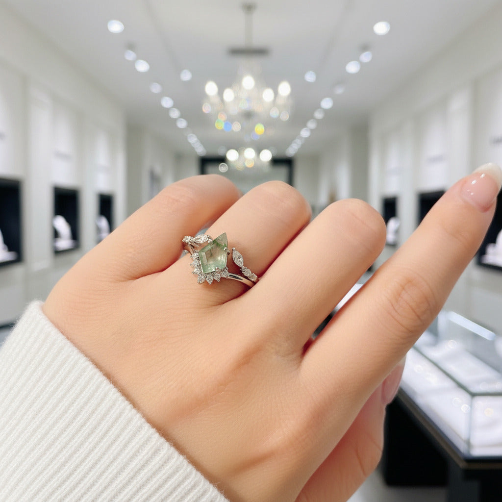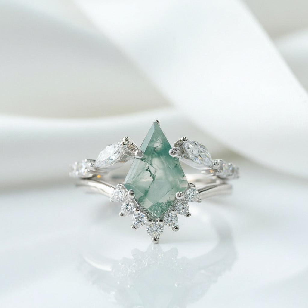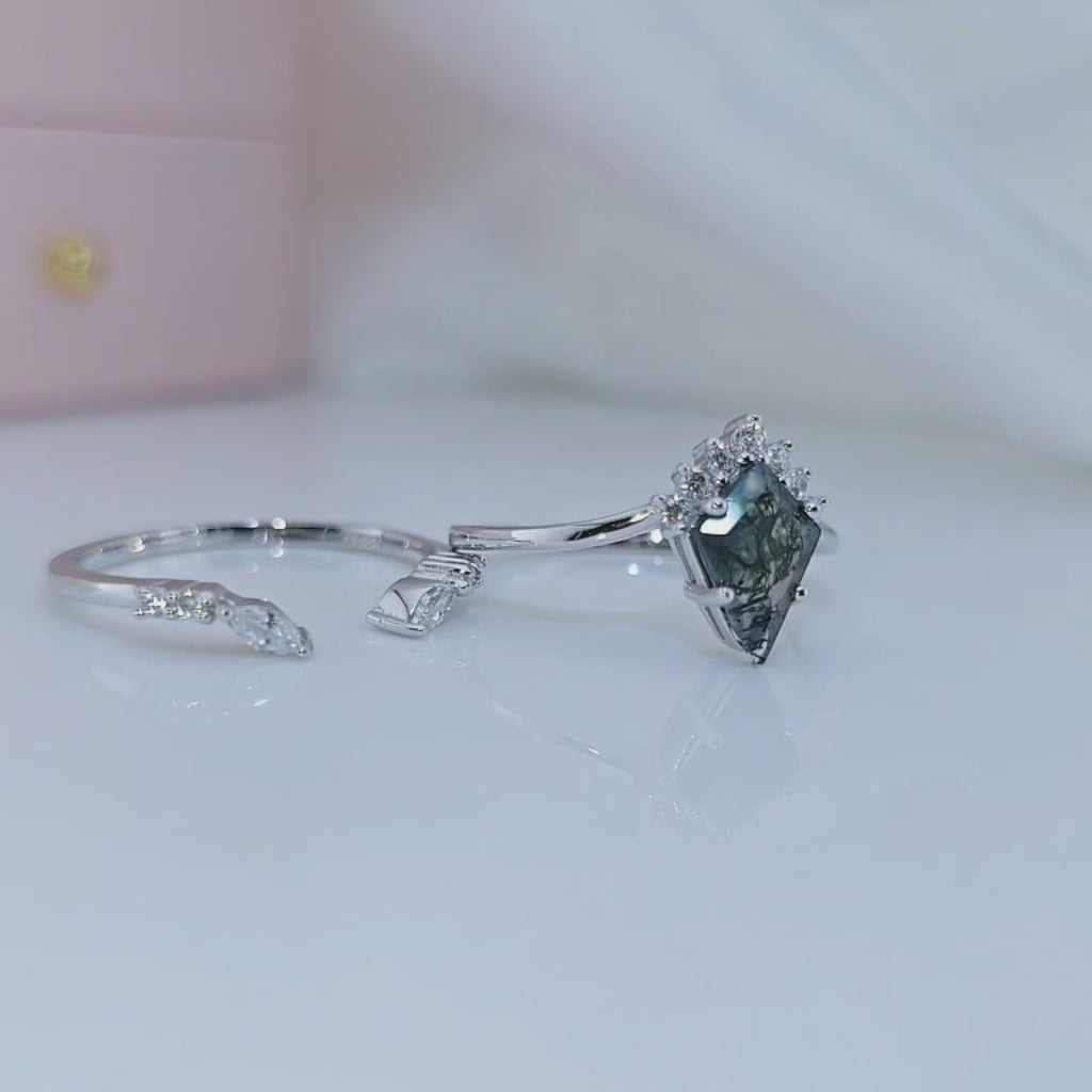 Fall in love with this stunning Natural Moss Agate Rhombus Shape Engagement Ring, which combines expert craftsmanship and sustainably sourced materials to create a piece that will last a lifetime. Feel confident wearing a ring that not only looks beautiful, but also aligns with your values of ethical sourcing. It's a symbol of love that you can truly feel good about.