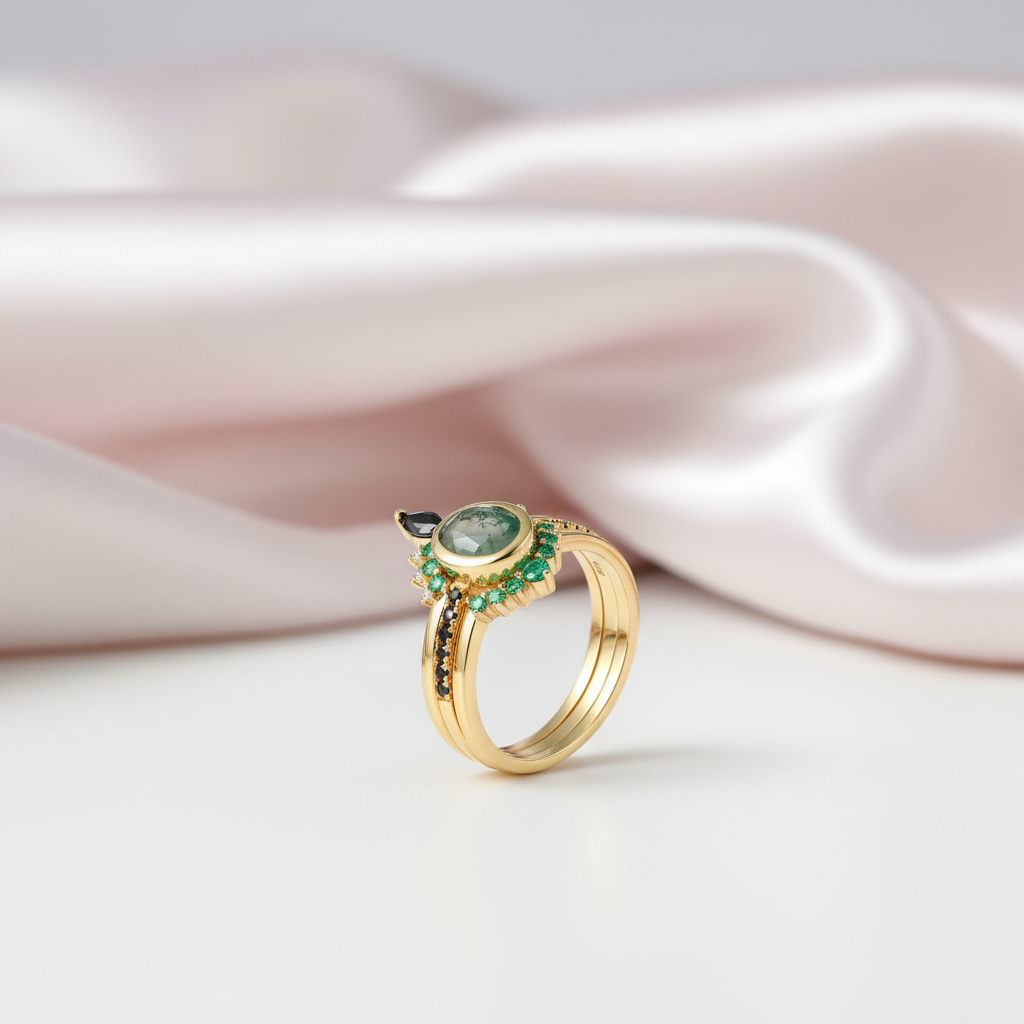 Oval cut Natural Moss Agate Yellow Gold Wedding Ring Set