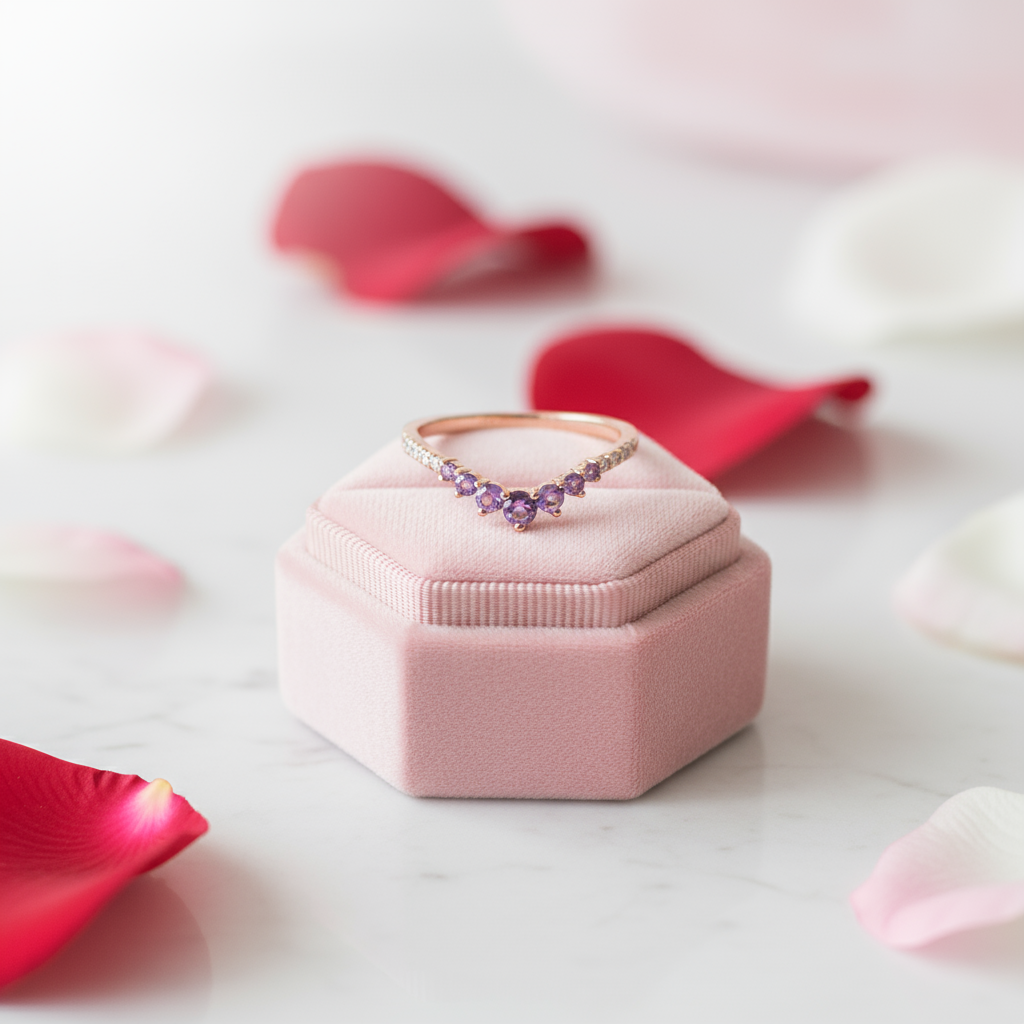 Delicate and radiant, this Rose Gold Amethyst Wedding Band features hand-set simulated diamonds that capture the brilliance of natural stones. Its sleek, vintage-inspired design makes it perfect as a wedding ring, promise ring, engagement band, or stacking ring for daily wear.