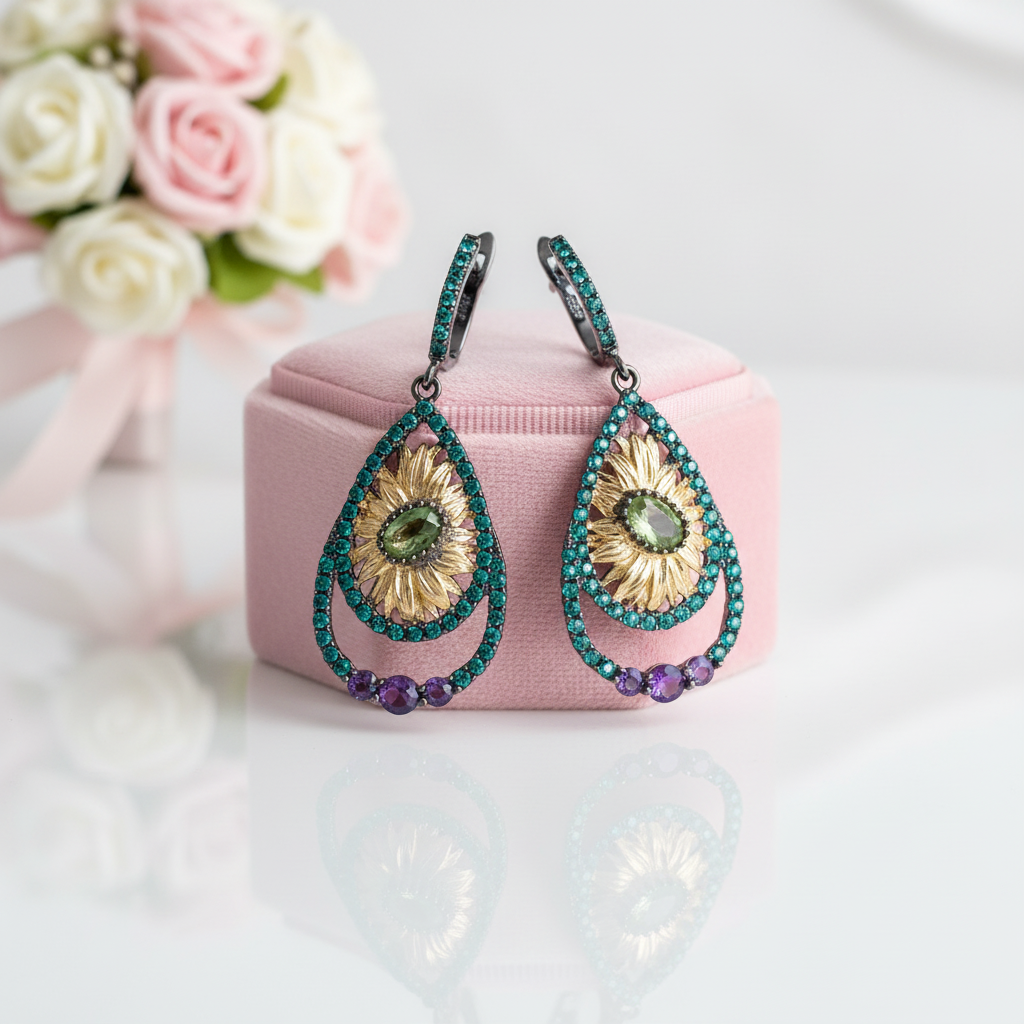 These elegant drop earrings feature a 1.03ct peridot as the centerpiece, complemented by amethyst and nano peridot side stones. Crafted from 925 sterling silver with gold plating, they showcase a refined sunflower design that adds a touch of sophistication to any ensemble.