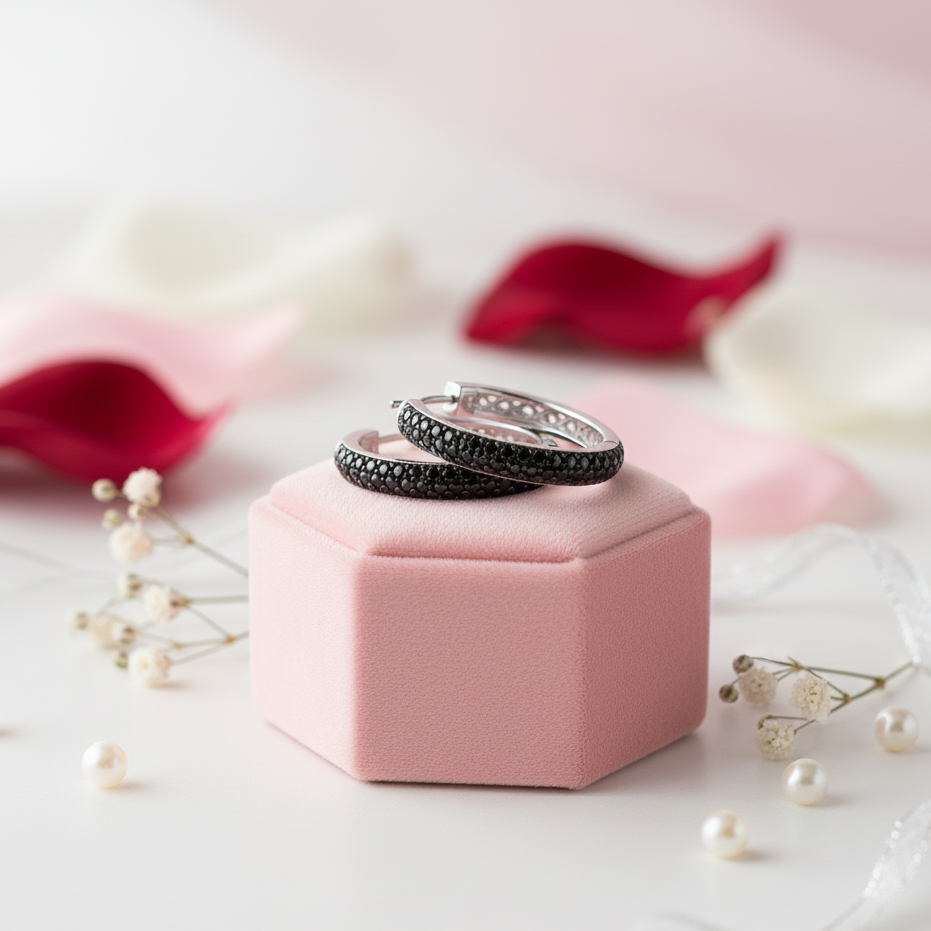 Made from 925 sterling silver dipped 5x in white gold, these hoop earrings feature delicate natural black spinel stones in a round shape measuring 1.3mm. The contrast of black spinel against white gold adds a touch of elegance.