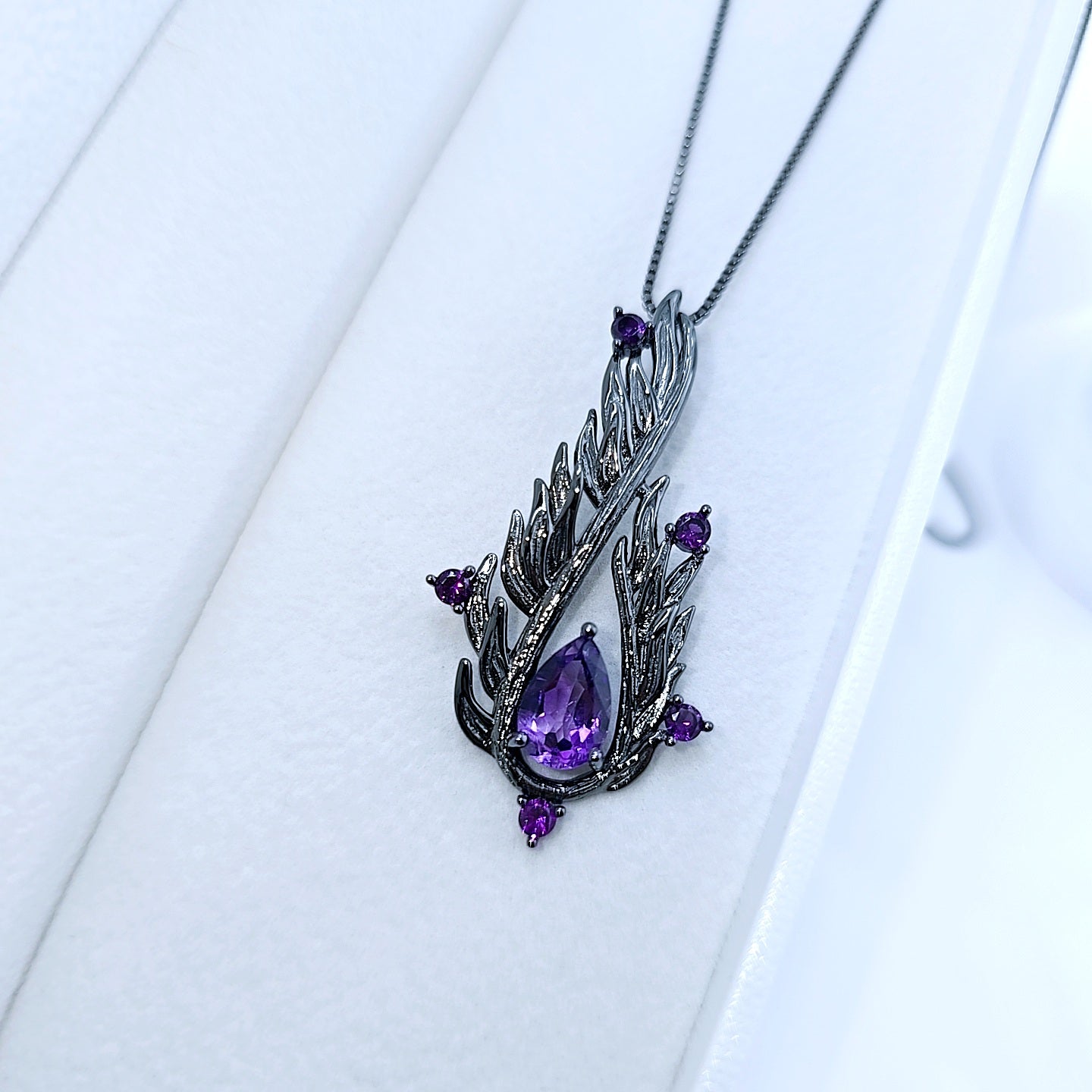 Add a touch of glamour to your look with our Handmade Angel's Wing Natural Amethyst Gemstone Necklace. The pear cut natural Amethyst gemstone steals the show with its vibrant purple hue, while the intricate design of the necklace adds a stylish flair. Crafted with high-quality materials, this necklace offers a chic and affordable way to enhance your wardrobe.