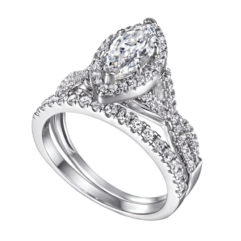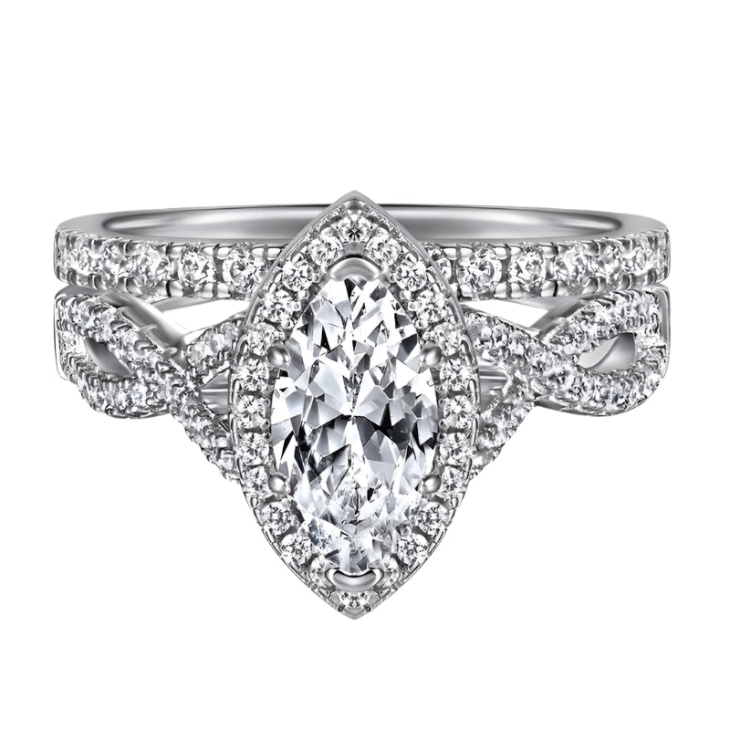 Looking for a celebrity-inspired engagement ring that's both beautiful and affordable? Our 1.0 ct Marquise Cut Certified Moissanite White Gold Engagement Ring Set is just what you need! With its stunning marquise cut center stone, sparkling halo detailing, and unique crisscross band design, this ring is sure to turn heads. And best of all, moissanite is a budget-friendly alternative to diamonds, so you can get a high-quality engagement ring without breaking the bank.