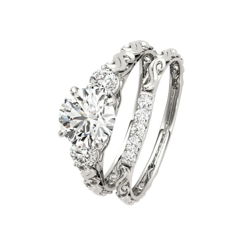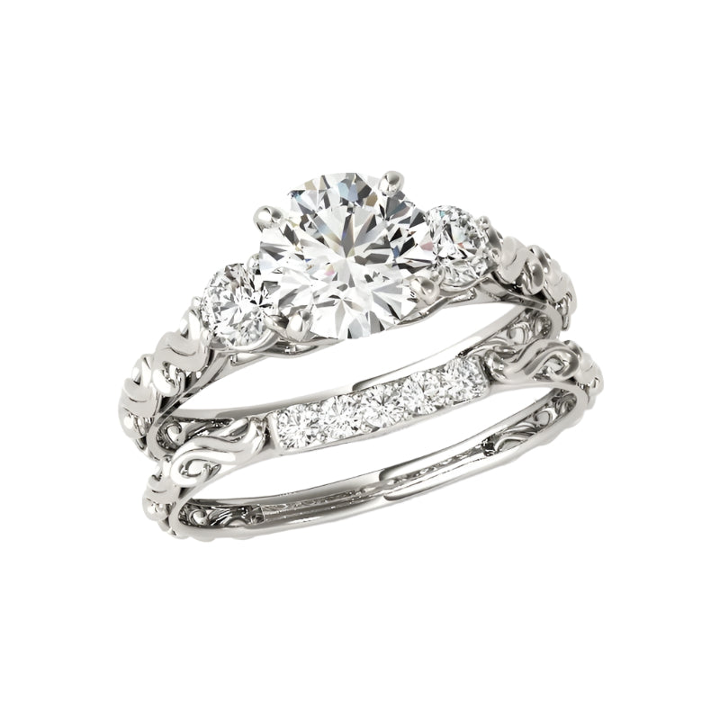 The 1ct Round Cut Certified Moissanite Three Stones Ring Set is the perfect gift for that special someone in your life. With three sparkling, round cut Certified Moissanite stones held securely in prong settings, this ring is sure to catch everyone's eye. The unique band design adds an extra touch of elegance and is truly a gorgeous addition to any jewelry collection.