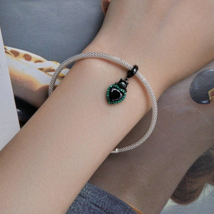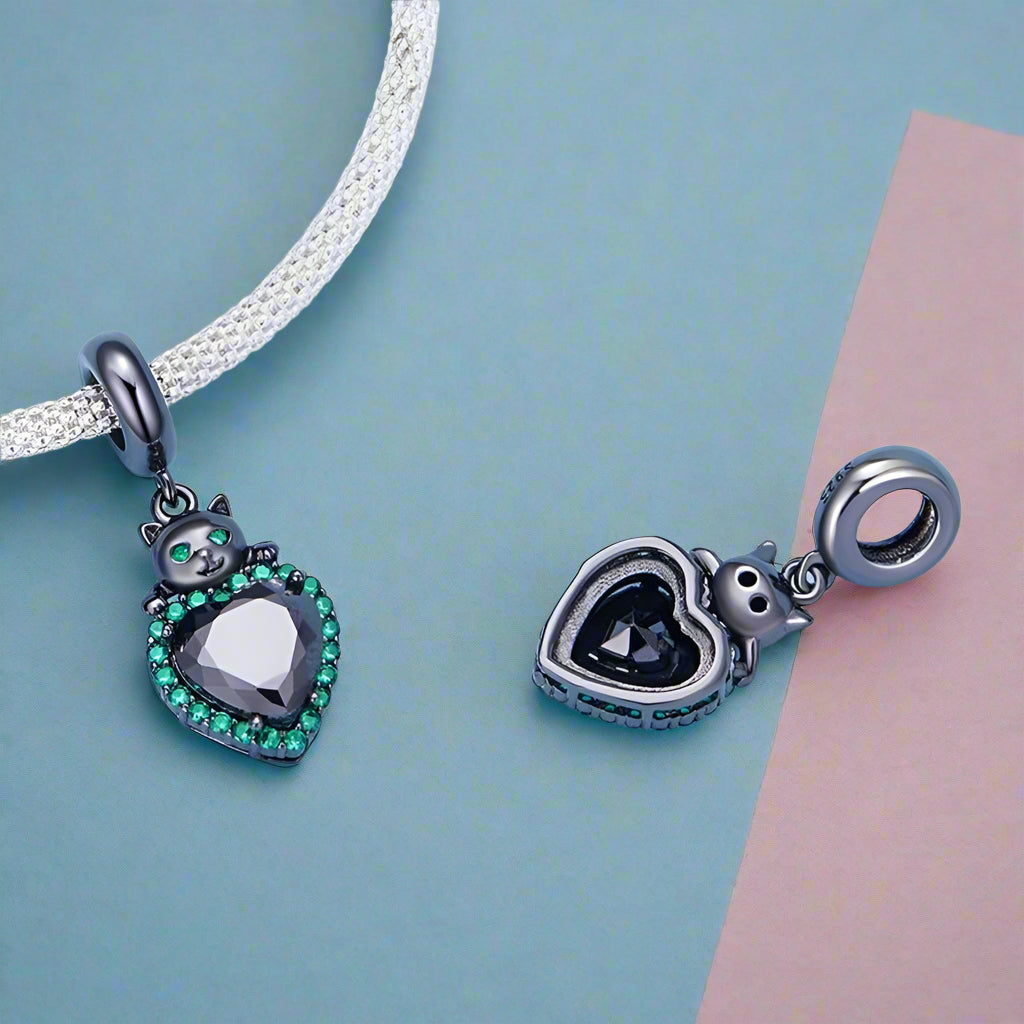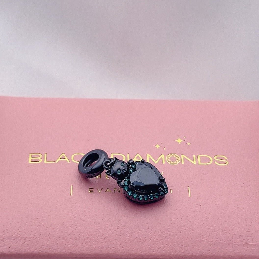 Express your wild and naughty side with the one-of-a-kind Black Kitty with Heart Charm from Black Diamonds New York. This unique and affordable piece of jewelry is crafted from a combination of 92.5% pure silver, 7.5% high quality and hypoallergenic metals. It features a stunning black kitty lying on a black heart love which is edged with green Diamond Alternative , forming an elegant and dark hanging bead. Show off your adventurous spirit with the Black Kitty with Heart Charm and feel the difference!