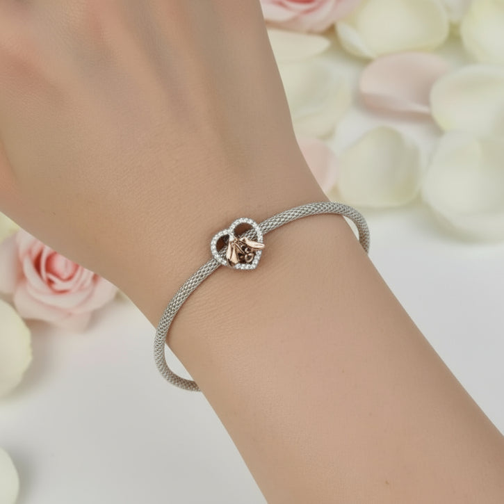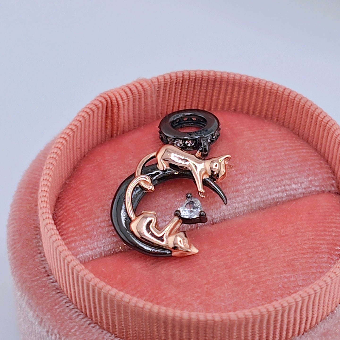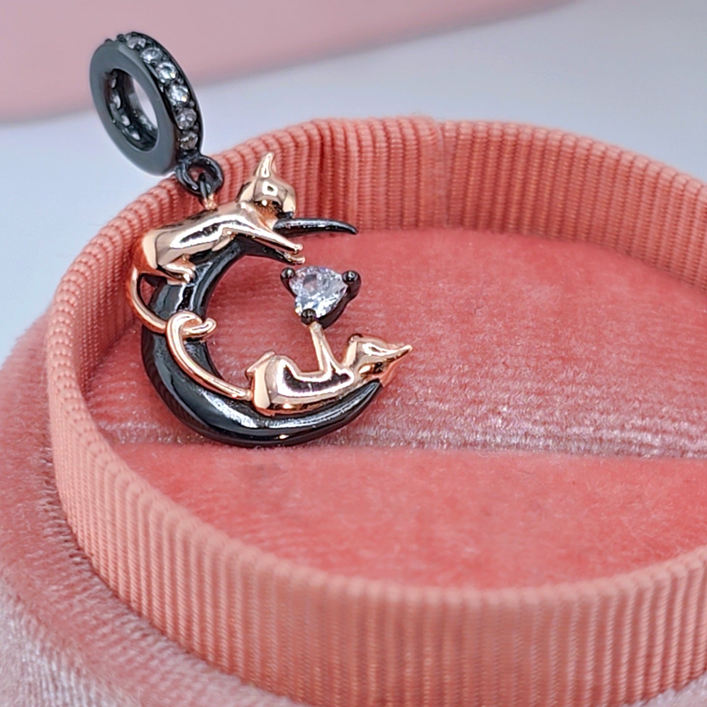 Add a playful touch to your accessories with our Playful Pet Kissing Cat Charm. This charming piece features stunning round stones set in 925 silver dipped 5x Platinum & Rose Gold, giving it a luxurious look without the hefty price tag. Treat yourself to this gorgeous charm today and elevate your jewelry game!