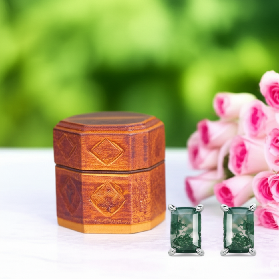 Crafted from lustrous 925 sterling silver, these exquisite Emerald Cut Moss Agate Stud Earrings feature stunning Moss Agate gemstones. Upgrade your style with this luxurious, one-of-a-kind piece.