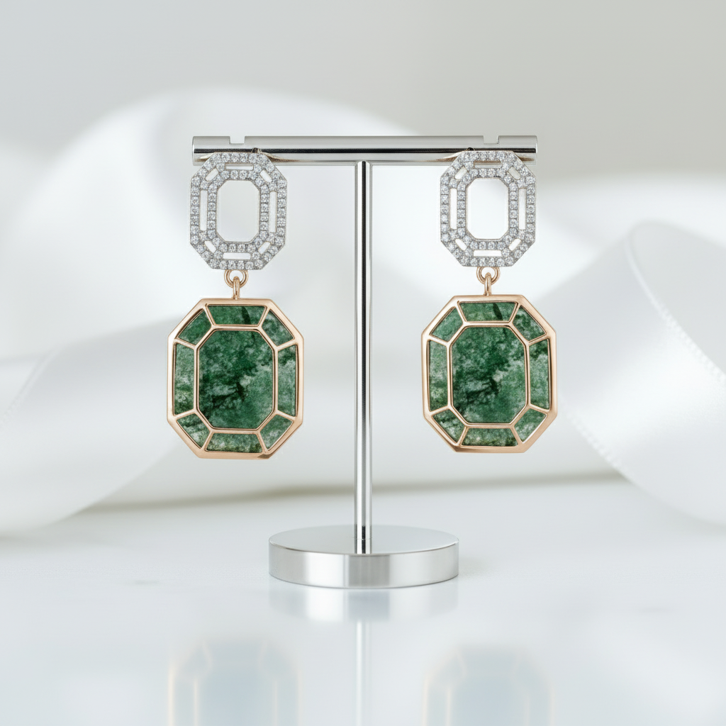 Experience the allure of luxury with our Geometry Cut Moss Agate Drop Earrings, intricately crafted from 925 sterling silver and featuring a stunning 13*15.5mm moss agate stone. The drop earring design adds an elegant touch, while the created diamond side stone elevate the exclusivity of this premium piece.