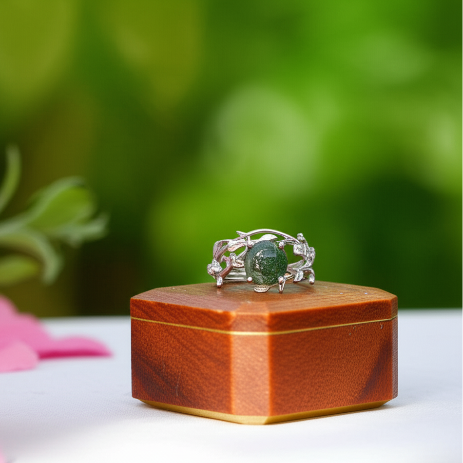 Crafted from 925 sterling silver, this exquisite Green Moss Agate Vintage Leaf Style Resizable Ring Set Set features a stunning moss agate stone set in a channel setting. A subtle nod to nature's beauty, this ring set exudes elegance and sophistication.