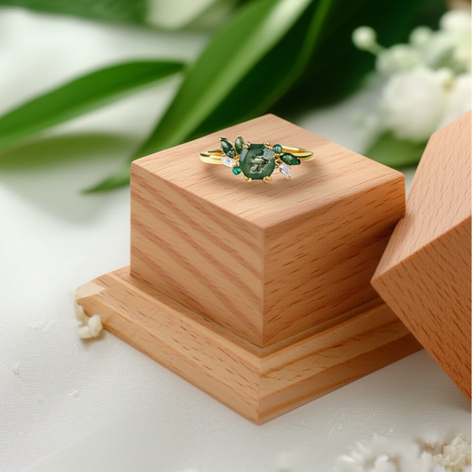 Elevate your engagement with our Natural Moss Agate Ring. Made with exquisite 925 Sterling Silver, featuring a 6*6mm Agate main stone and stunning prong setting with a choice of Rose, Yellow, or White Gold plating. This luxurious ring is an exclusive must-have for the discerning individual.
