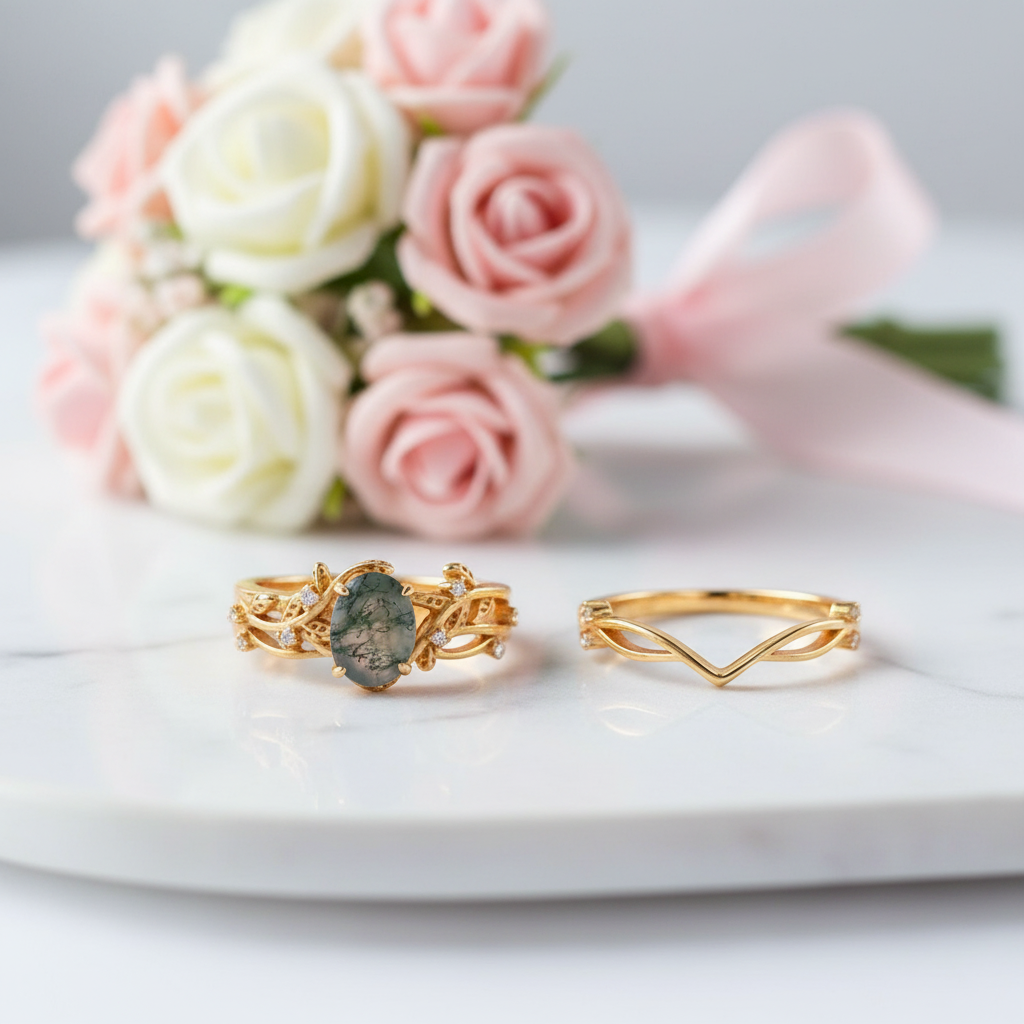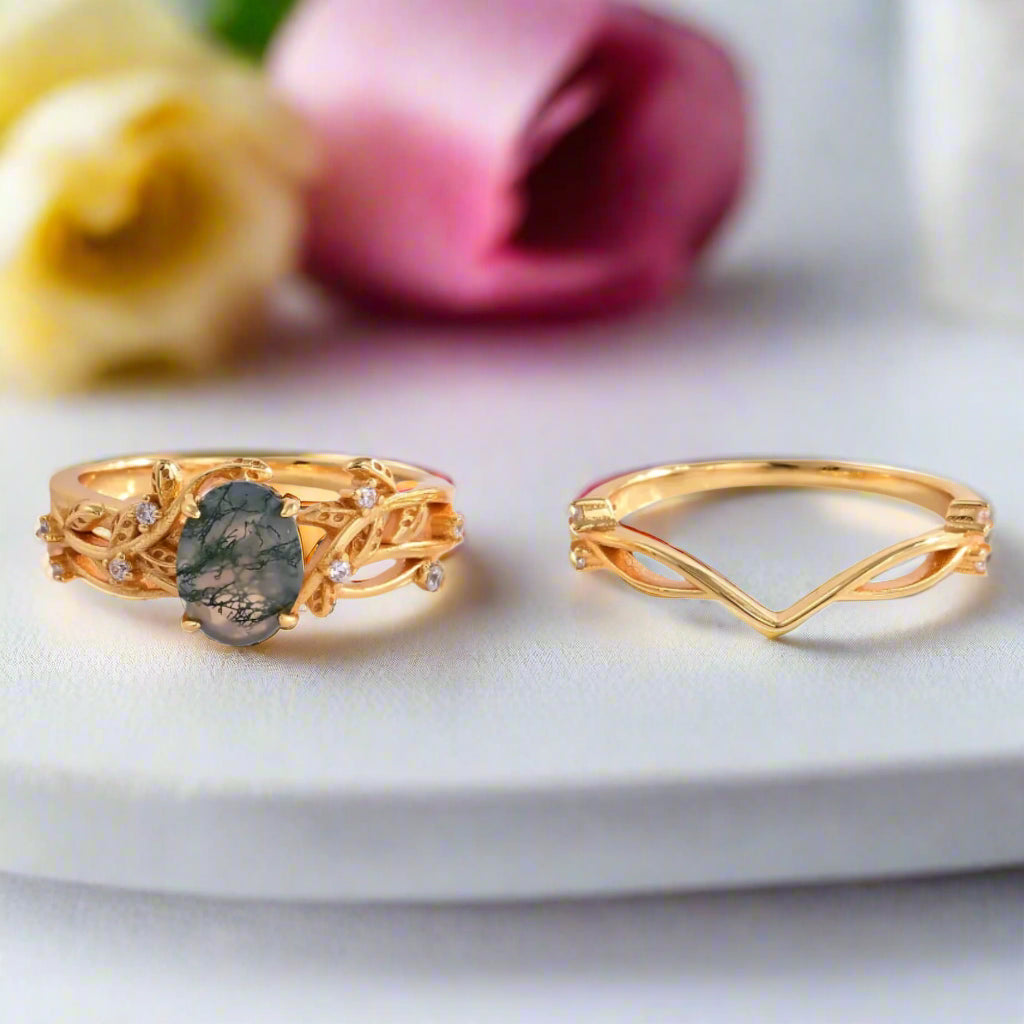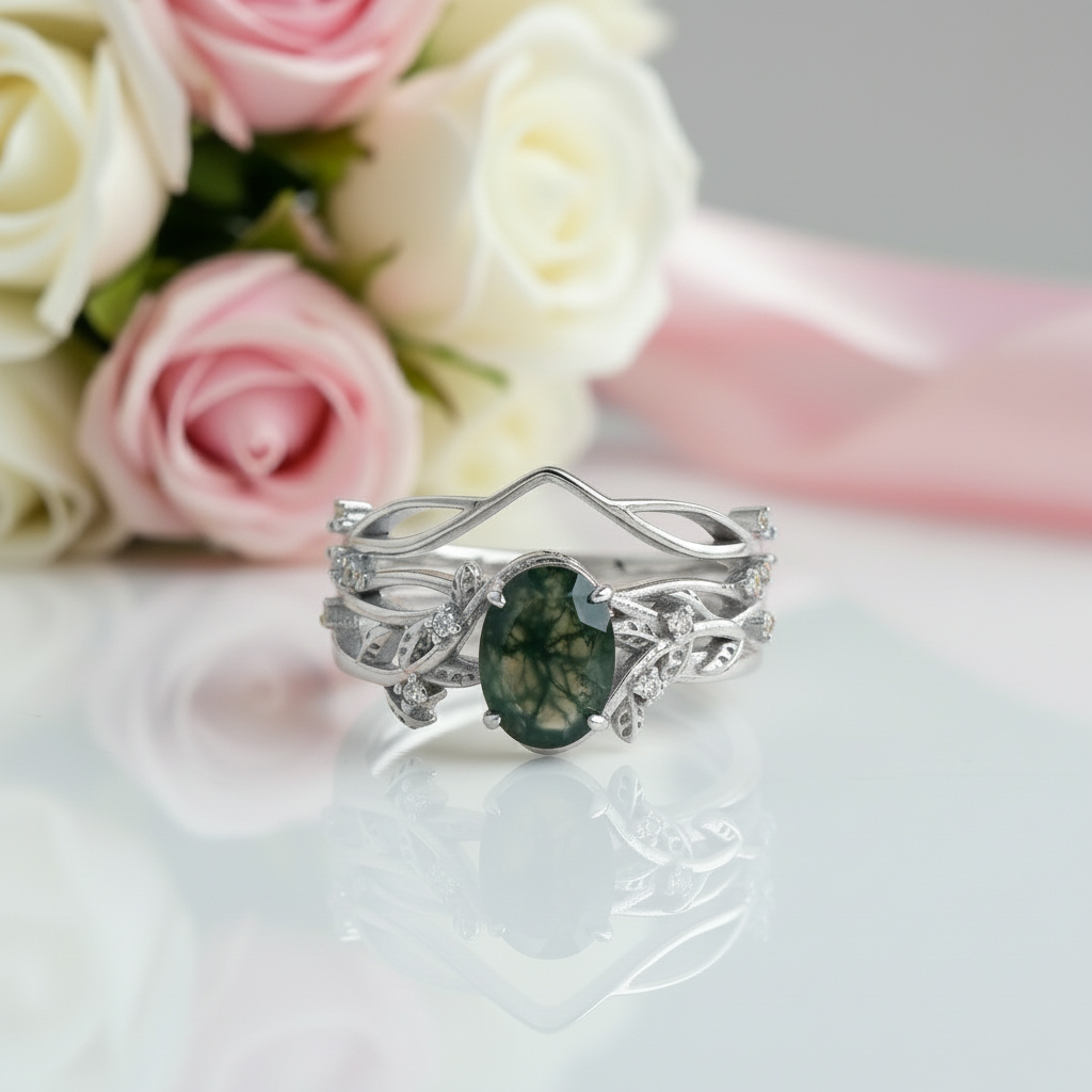 Crafted with the utmost care and precision, this elegant and exclusive Oval-cut Moss Agate Leaf Design Ring Set exudes luxury. Made from high-quality 925 Sterling Silver, it also features a stunning Moss Agate stone, secured in place by a delicate prong setting. Perfect for those who appreciate the finer things in life, this set is truly a masterpiece.