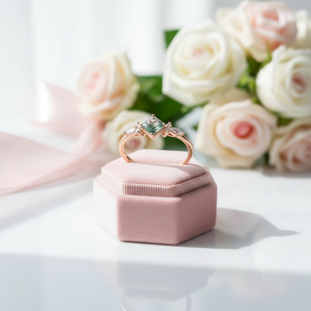 Princess Cut Moss Agate Art Deco Vintage Engagement Ring Set