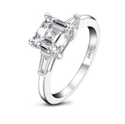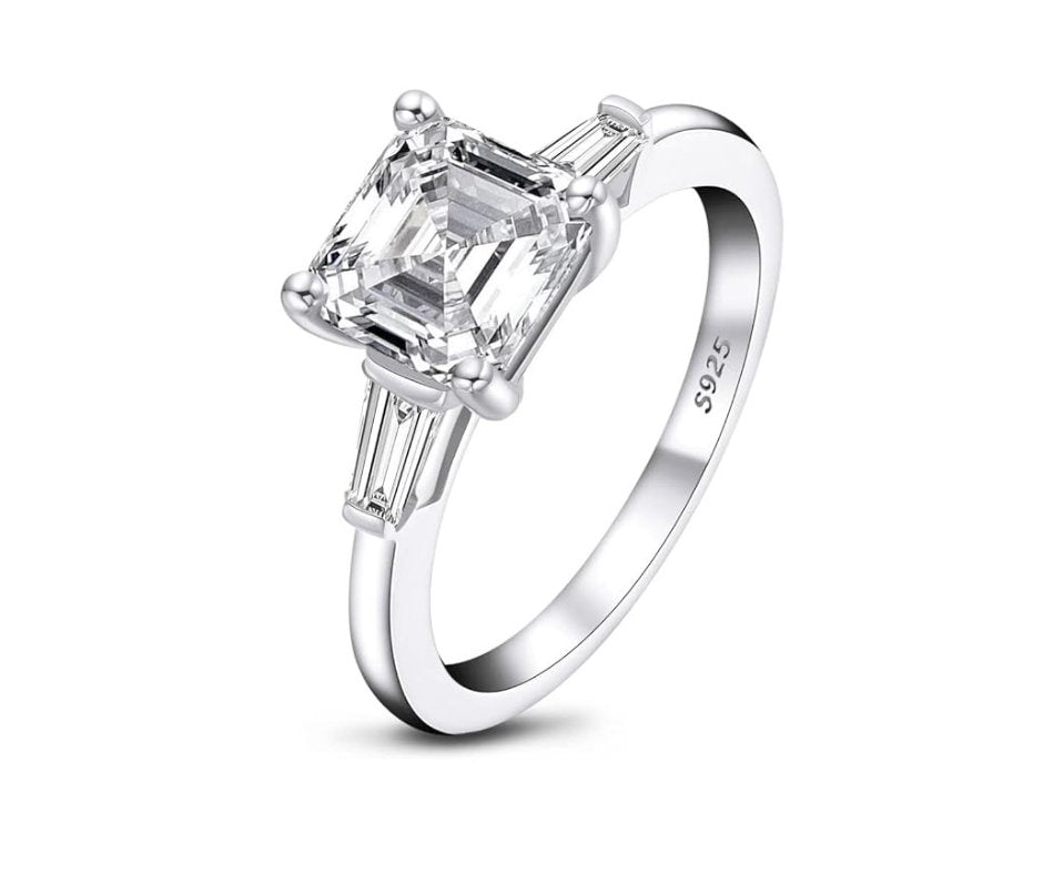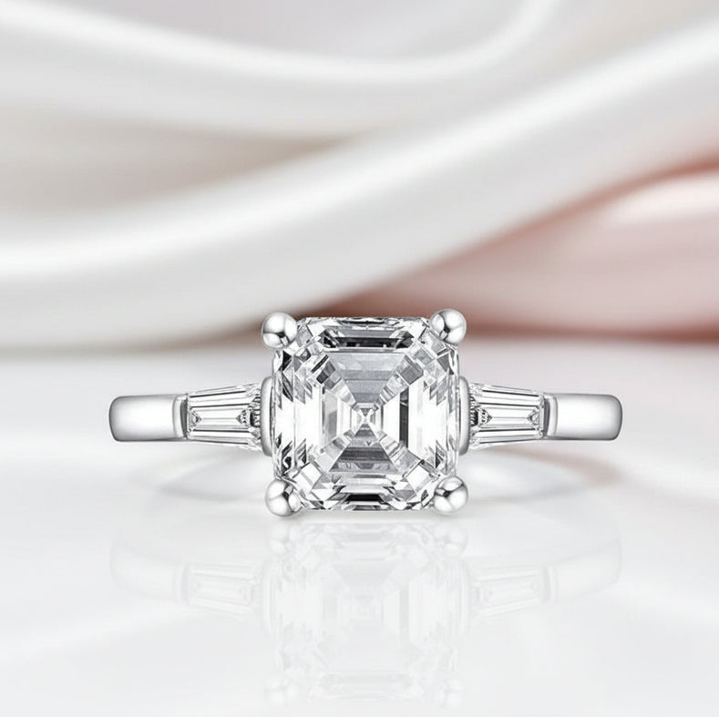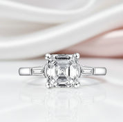 Are you looking for a classic and brilliant engagement ring for your loved one? Look no further than this exquisite 14k White Gold Asscher Cut Certified Moissanite Diamond Engagement Ring from Black Diamonds New York. Crafted from high-quality materials, this piece has two clear side stones and it glimmers with a luminous sparkle. This beautiful ring is elegant and affordable and it is the perfect way to show your love.