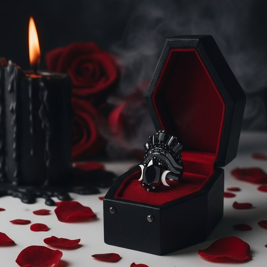 The Always and Forever Gothic Promise Rings feature a breathtaking oval cut black diamond set in radiant 14k rose gold, surrounded by intricate gothic detailing. Perfect for alternative brides and dark romance lovers, this gothic bridal set captures eternal devotion with an edge of mystery and passion.