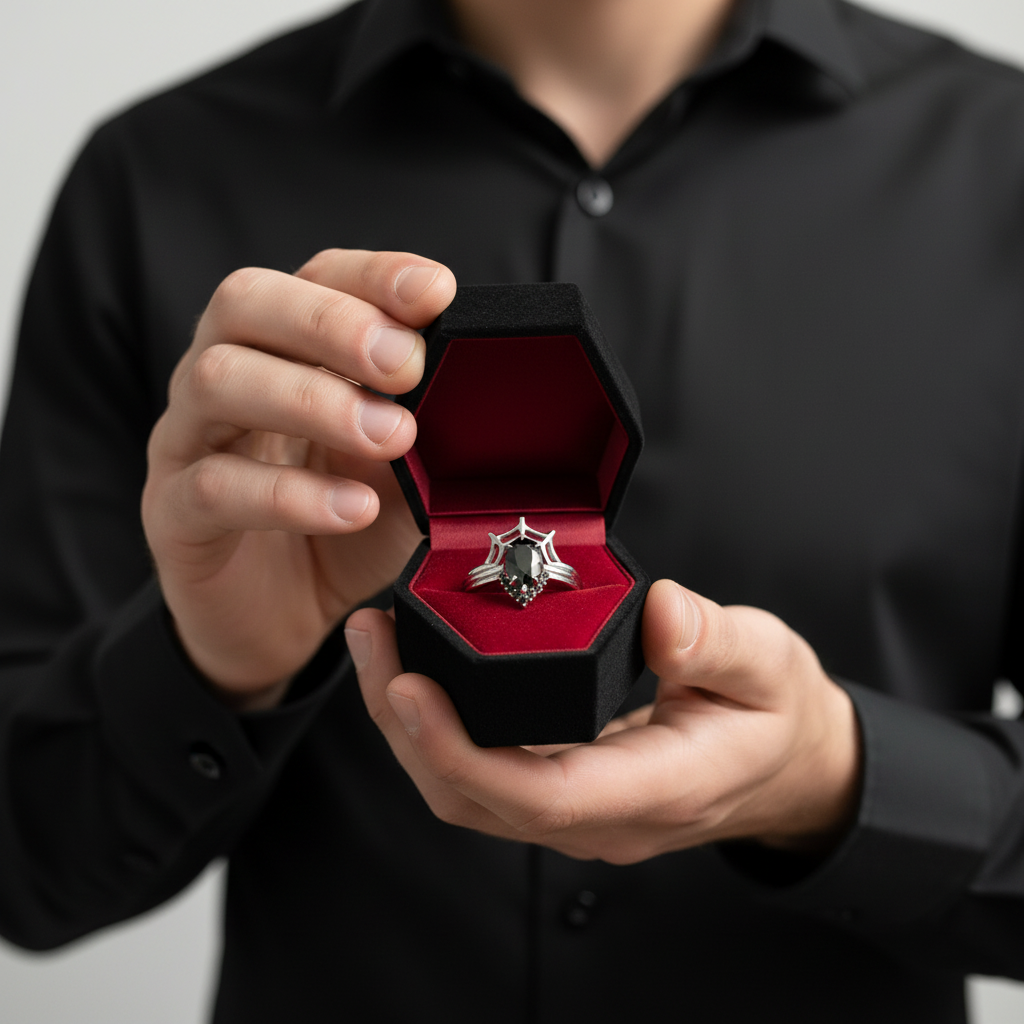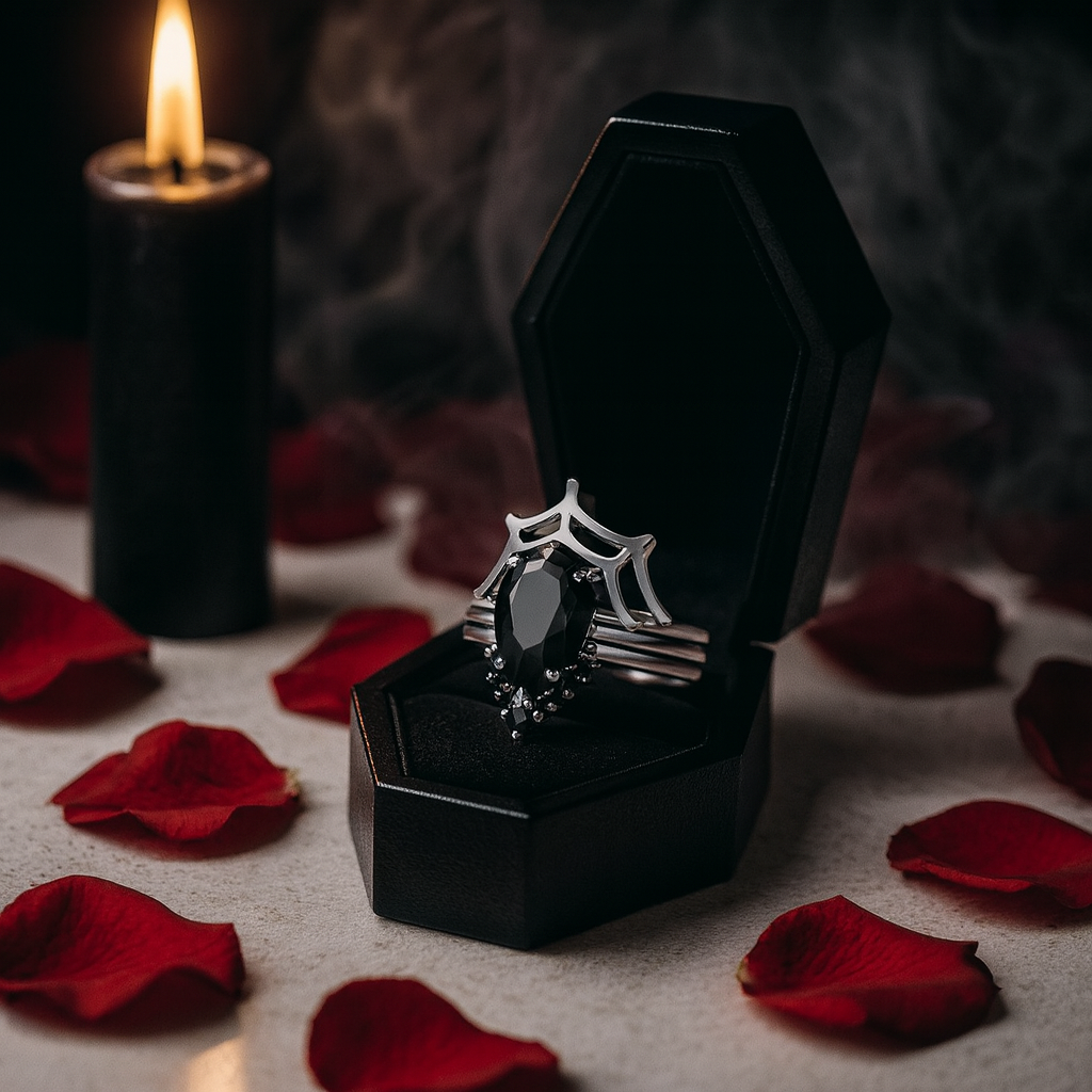 A striking three-piece ring set featuring pear-cut lab-grown diamonds in a delicate spider web design, crafted in 14K gold. Handmade by Black Diamonds New York, this gothic-inspired set is ideal for engagements, promises, and anniversaries. Bold, elegant, and deeply meaningful.