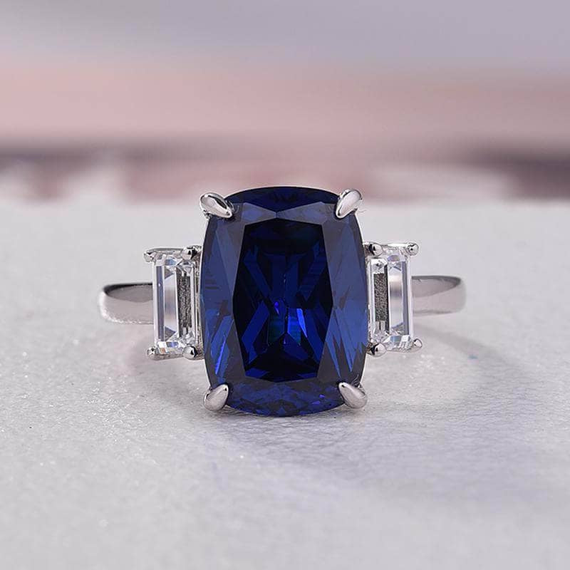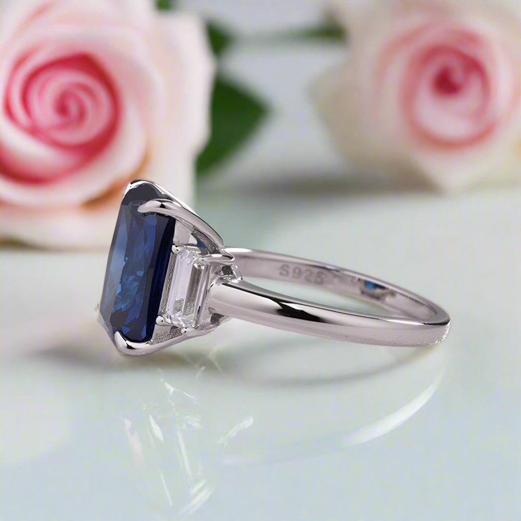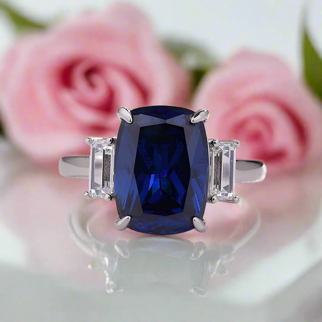Gorgeous Blue Sapphire Cushion Cut Three Stone Engagement Ring