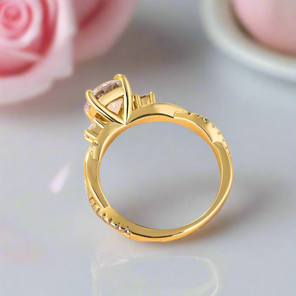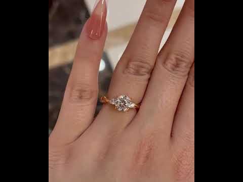 This Twist Round Cut Three Stone Engagement Ring is crafted with 14k solid gold and diamonds, creating a glittering centerpiece. A round-cut main stone is surrounded by round accent stones, while a twist band adds to the luxurious allure. Quality and affordability coalesce in this impressive, meaningful piece.