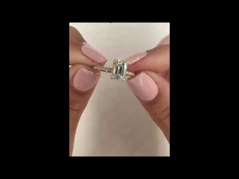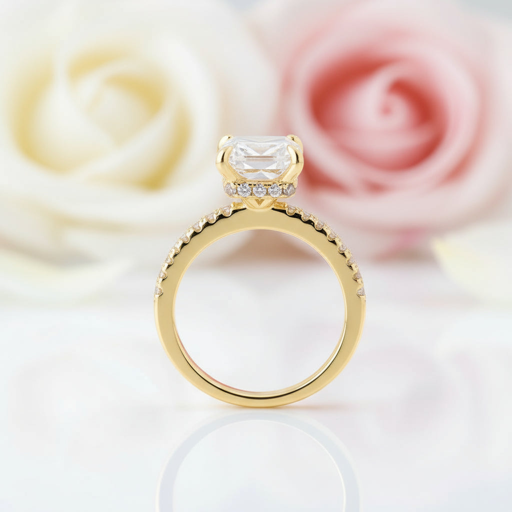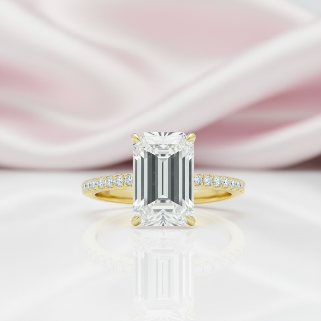 Yellow Gold Emerald Cut Diamond Engagement Ring Elegant emerald-cut diamond takes center stage in this 14k yellow gold engagement ring. A hidden halo of round side stones adds subtle sparkle without overwhelming the clean lines of the center stone. Certified moissanite delivers brilliant light performance at an accessible price point, perfect for those seeking luxury without compromise.
