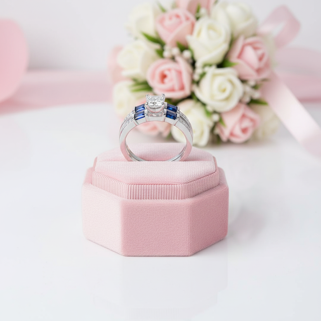 This 1.24 Ct princess cut ring features clear and blue diamond alternative stones in solid 925 sterling silver. Handcrafted for brilliant radiance and everyday durability. A versatile choice for engagements, anniversaries, or meaningful gifts.