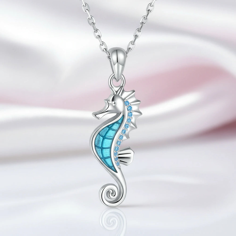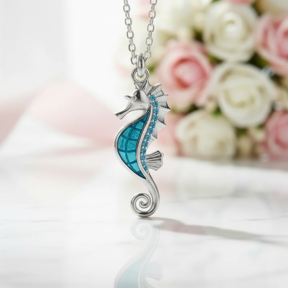 Add a touch of luxury to your ensemble with our Beautiful Seahorse Pendant Necklace by Black Diamonds New York. This exquisite piece features a seahorse pendant crafted with 925 silver and dipped 5x in 18k white gold, creating a stunning and sophisticated look. The round Diamond Alternative adds an extra element of beauty to this gorgeous necklace. Treat yourself to this affordable piece of jewelry and elevate your style to new heights.