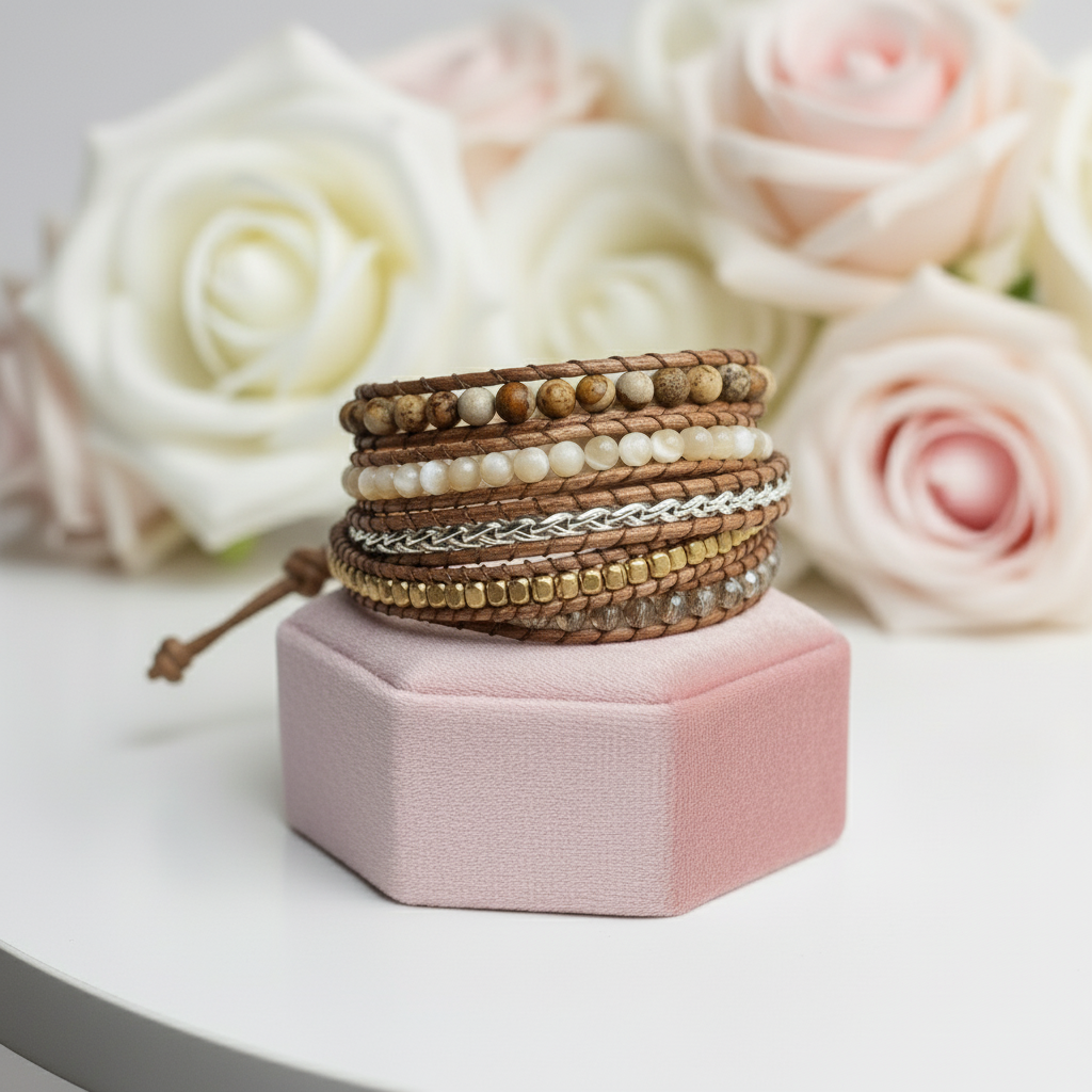 This handmade bracelet features five layers of natural Jasper stone interwoven with lustrous shell pearl and crystal-plated metal accents for a distinctly bohemian aesthetic. Constructed with a reliable stainless steel chain and secured by a nickel-free button closure, it's gentle on sensitive skin and built to last. A versatile accessory that brings earthy sophistication to any wardrobe.
