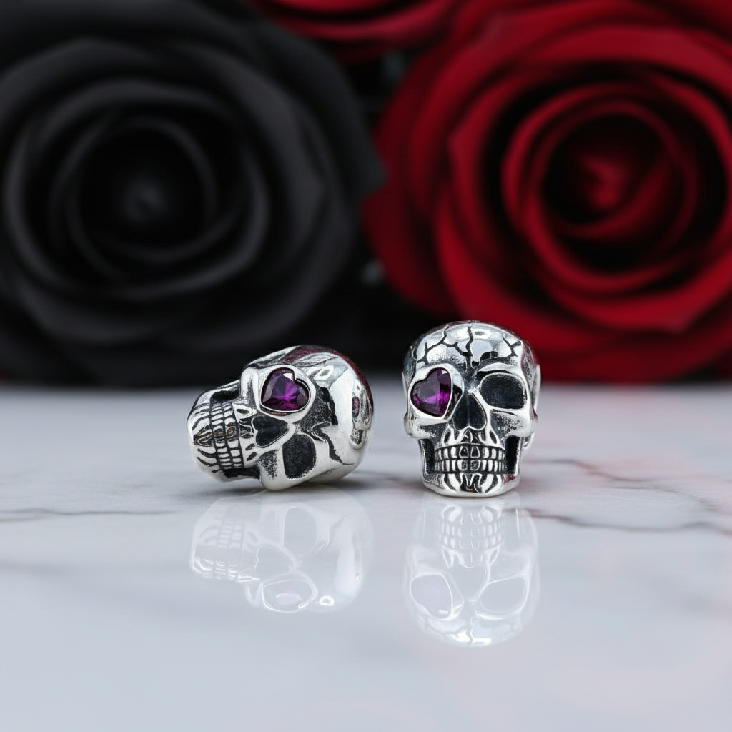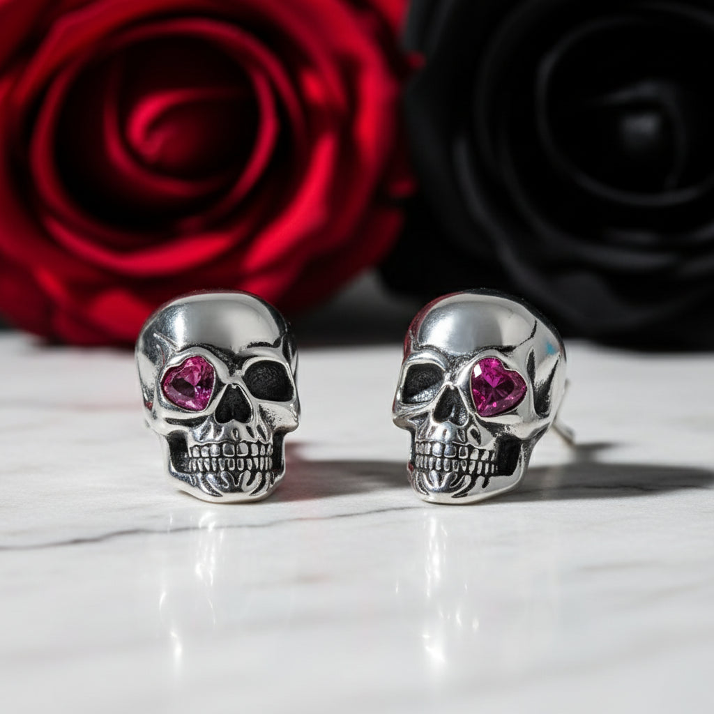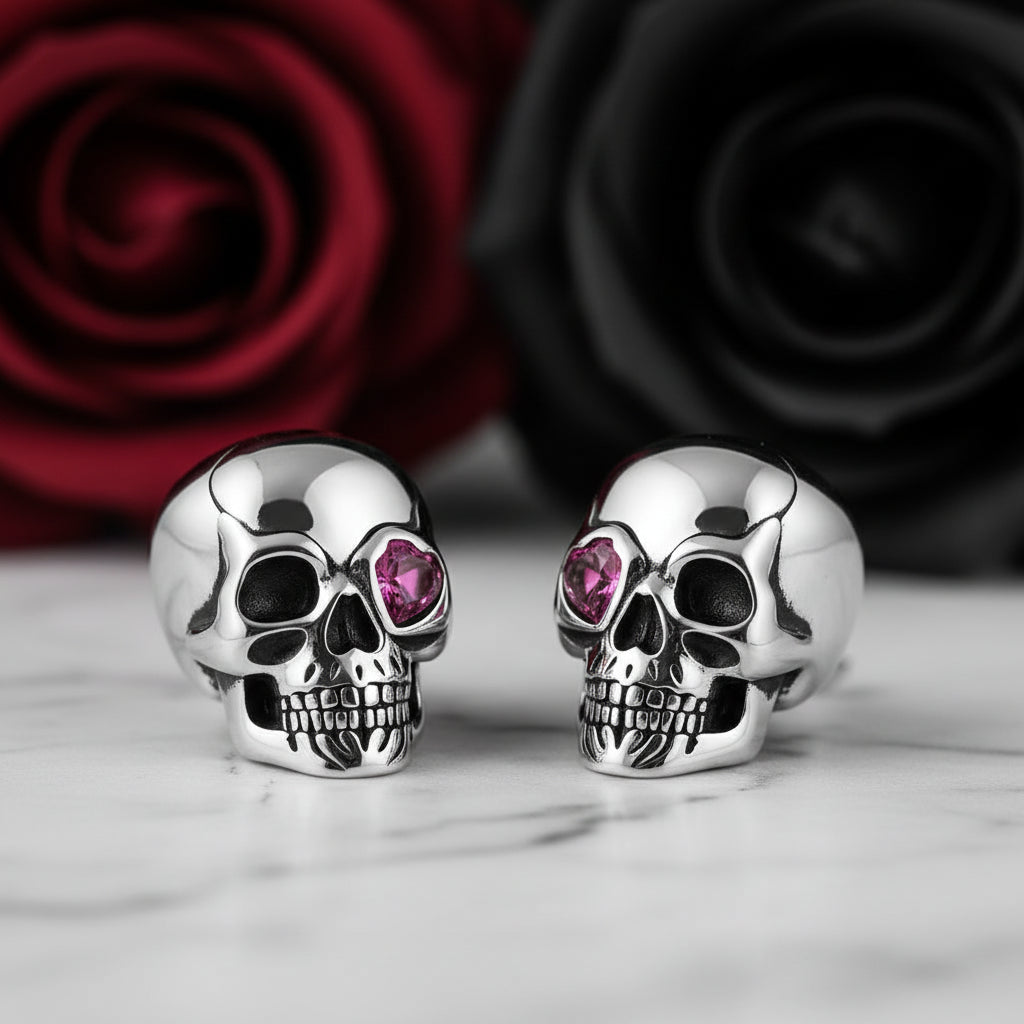 Cool Skull Pink Heart-shaped Diamond Stud Earrings