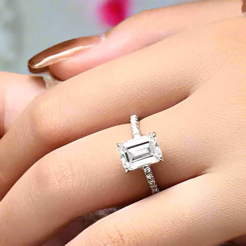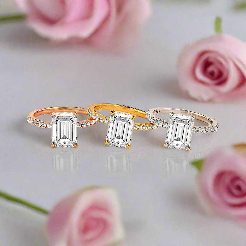 Crafted from premium 925 Sterling Silver, this elegant engagement ring showcases a certified emerald-cut Moissanite stone with brilliant D-color and VVS1 clarity. Available in white, rose, or yellow gold plating, it features a classic prong setting and is stamped with 925 for guaranteed purity, making it a timeless symbol of love and commitment.