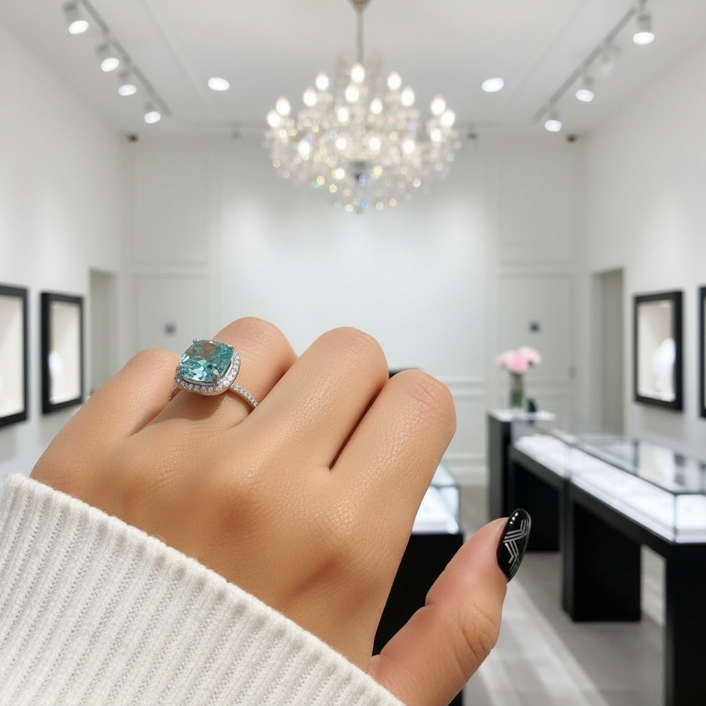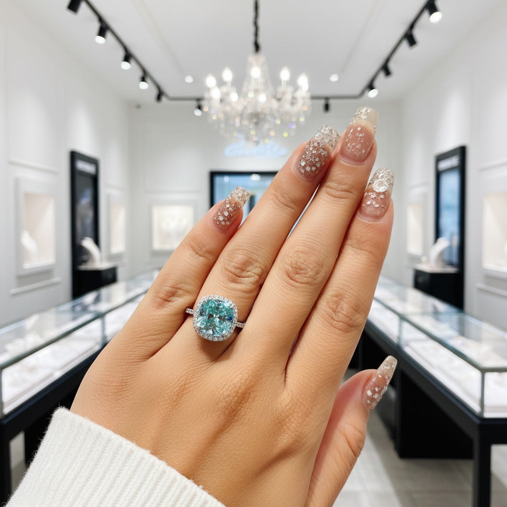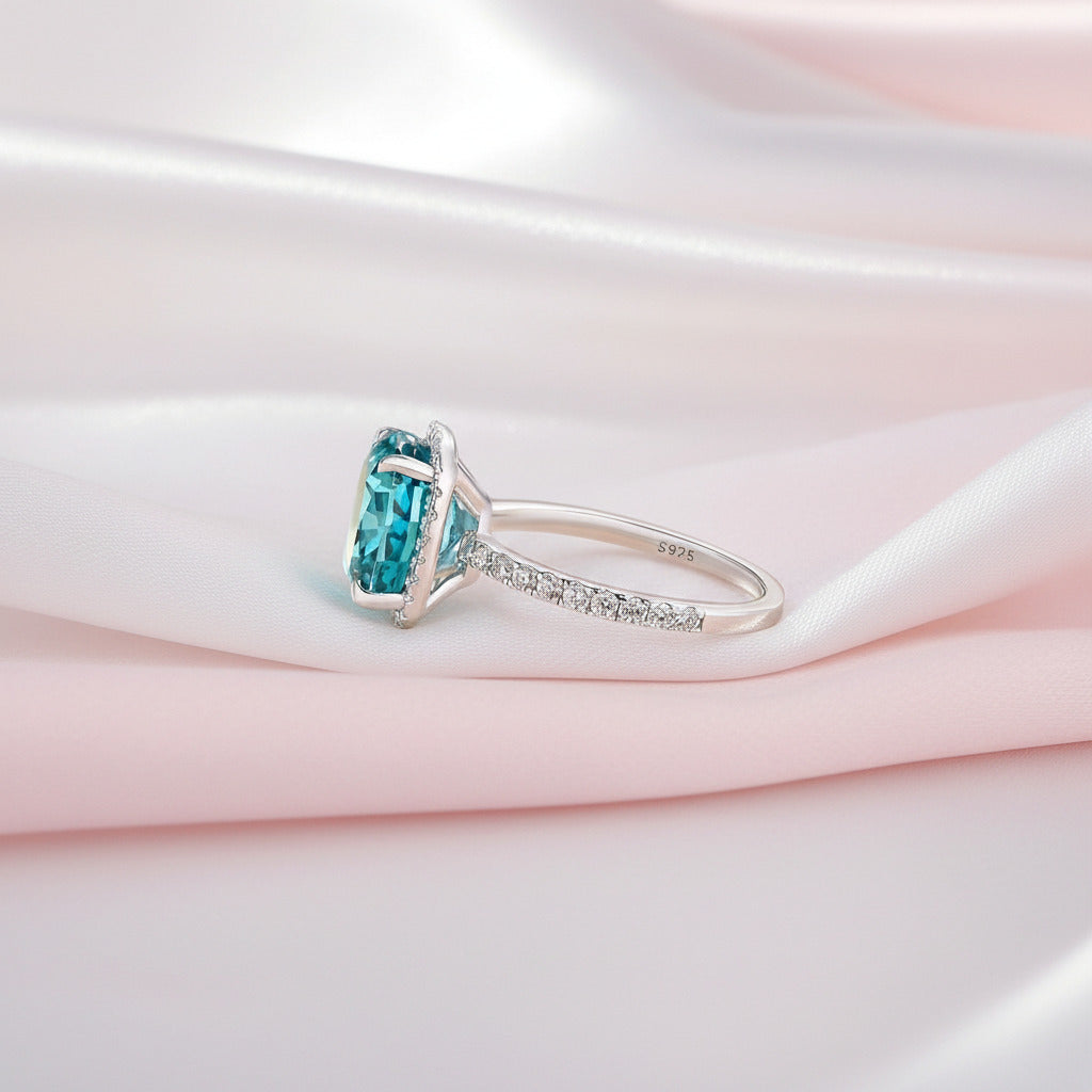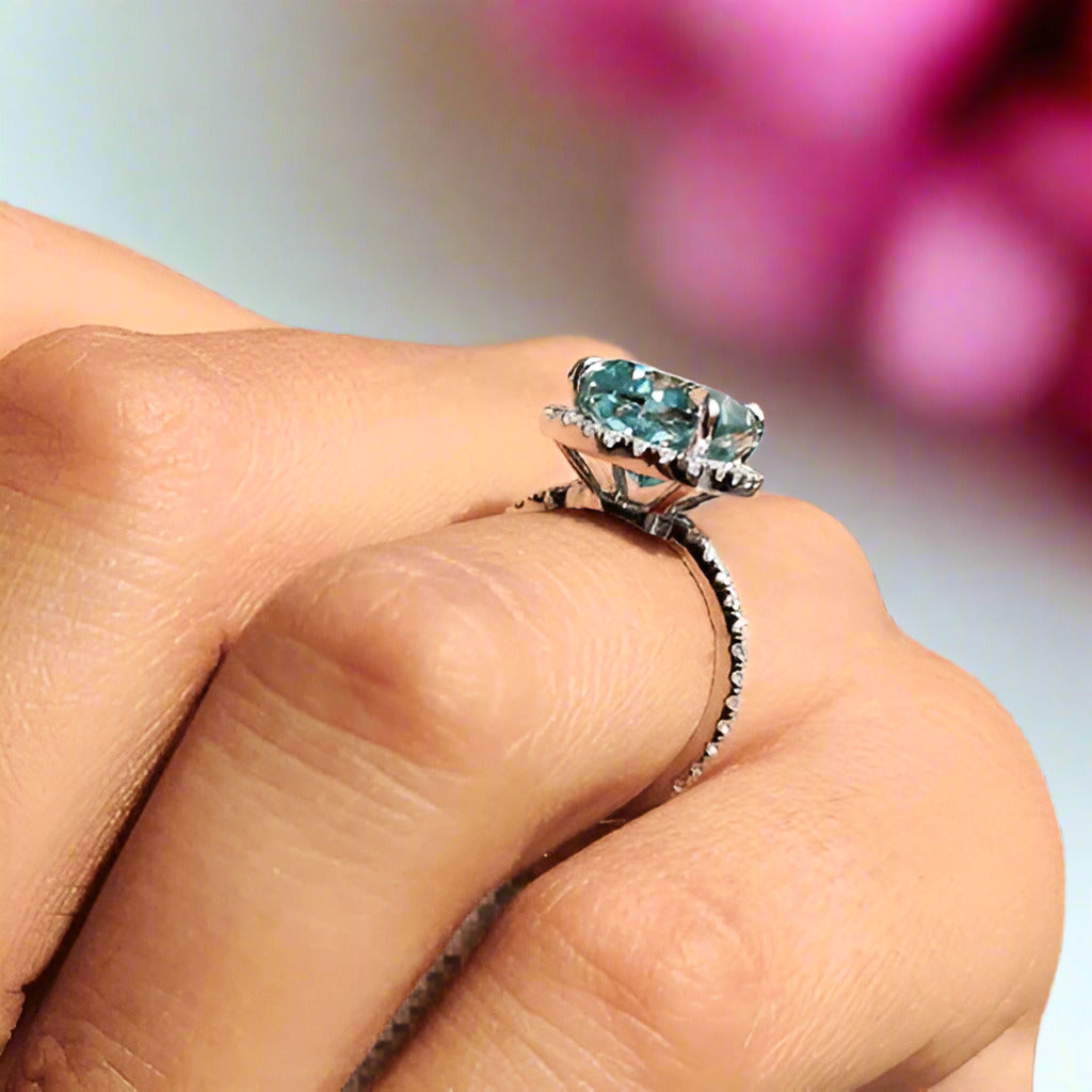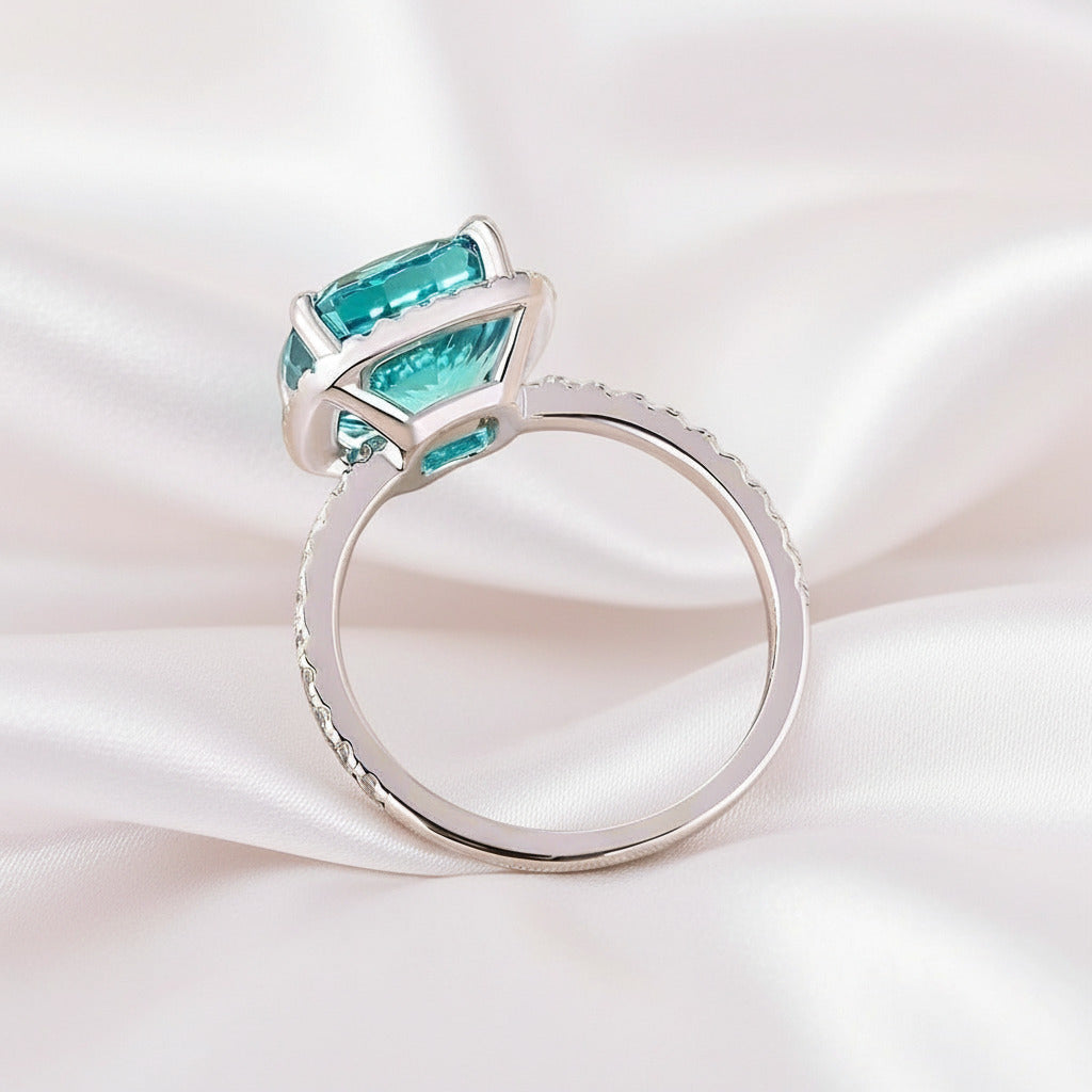 Exquisite Halo Cushion Cut Simulated Cyan Blue Engagement Ring
