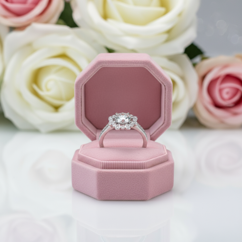 Rose gold ring and diamond ring on a pink velvet box with blurred flowers in the background