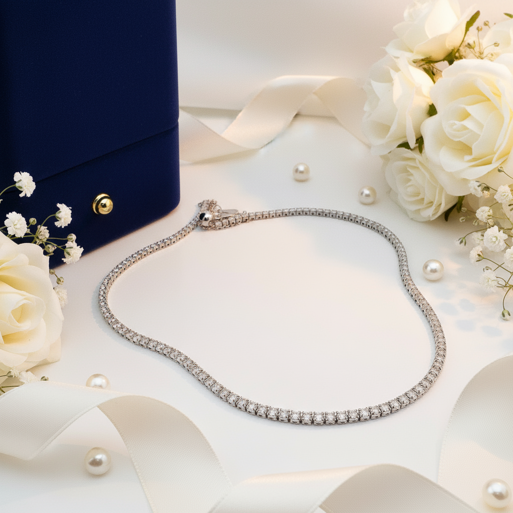 Revamp your jewelry assortment with our 2mm Round Certified Moissanite Diamond Adjustable Tennis Necklace. This exquisite accessory showcases glistening moissanite gems, expertly crafted for ultimate shimmer. The adjustable design guarantees a flawless fit each time, while the top-notch 925 silver dipped 5x in 18k gold provides an opulent touch. Don't let this alluring and captivating necklace, which is as reasonably priced as it is fashionable, slip through your fingers.