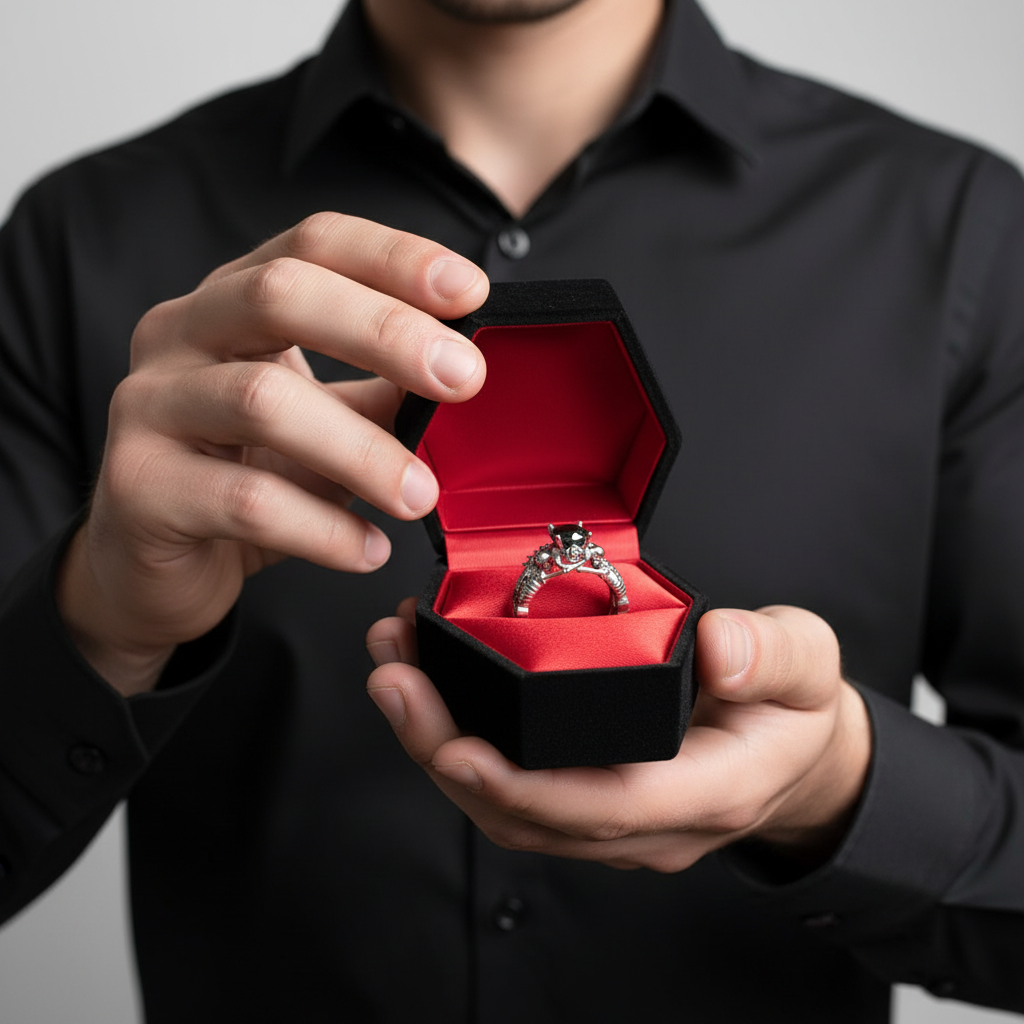 A stunning 1.5-carat black moissanite diamond set in a 14k gold skull band. This handcrafted gothic ring symbolizes eternal love with dark romance and timeless elegance. Ideal for those who embrace bold, unconventional style.